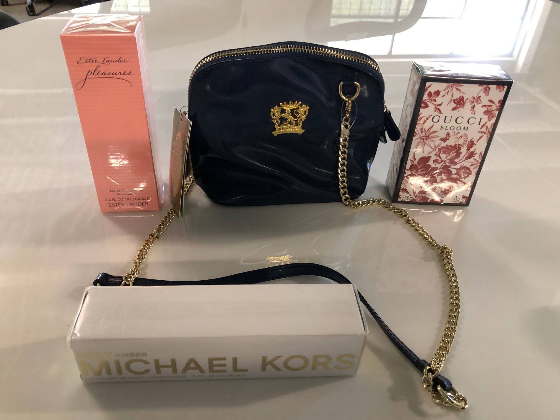 NAVY BLUE PRATESI ITALIAN LEATHER PURSE WITH MICHEAL KORS SEXY AMBER PERFUME, ESTEE LAUDER PLEASURES PERFUME WITH GUCCI BLOOM PERFUME AND DOLCE & GABBANA LIGHT BLUE PERFUME