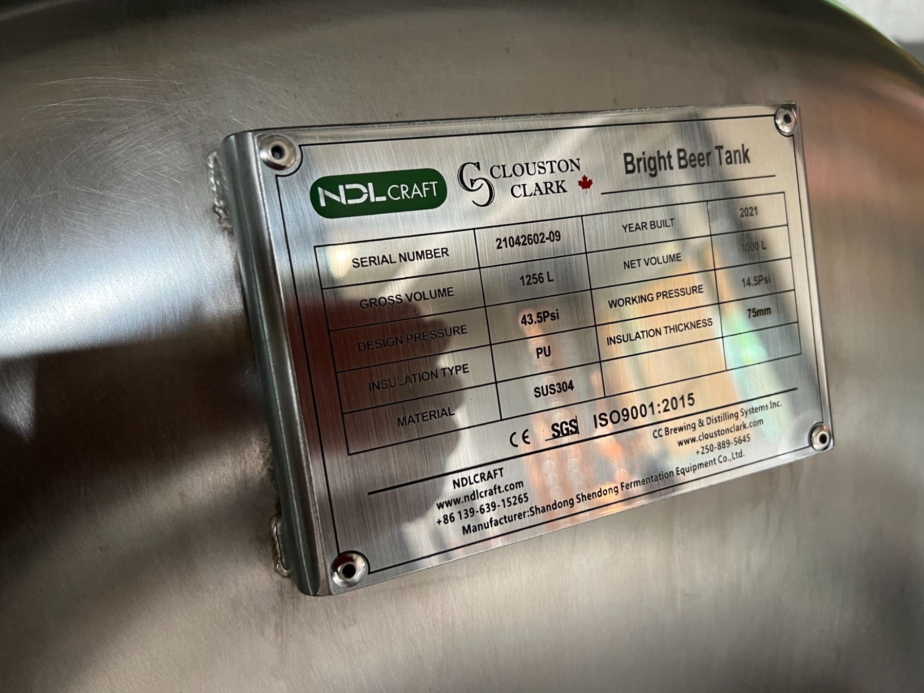 NDL CRAFT 10 HECTOLITER (1256 L) HORIZONTAL BRIGHT BEER TANK. WITH THERMAL PROBE,