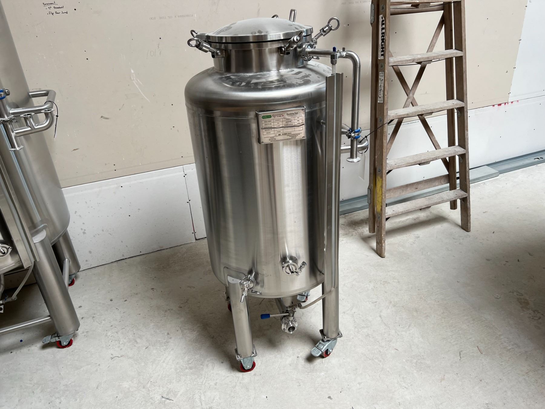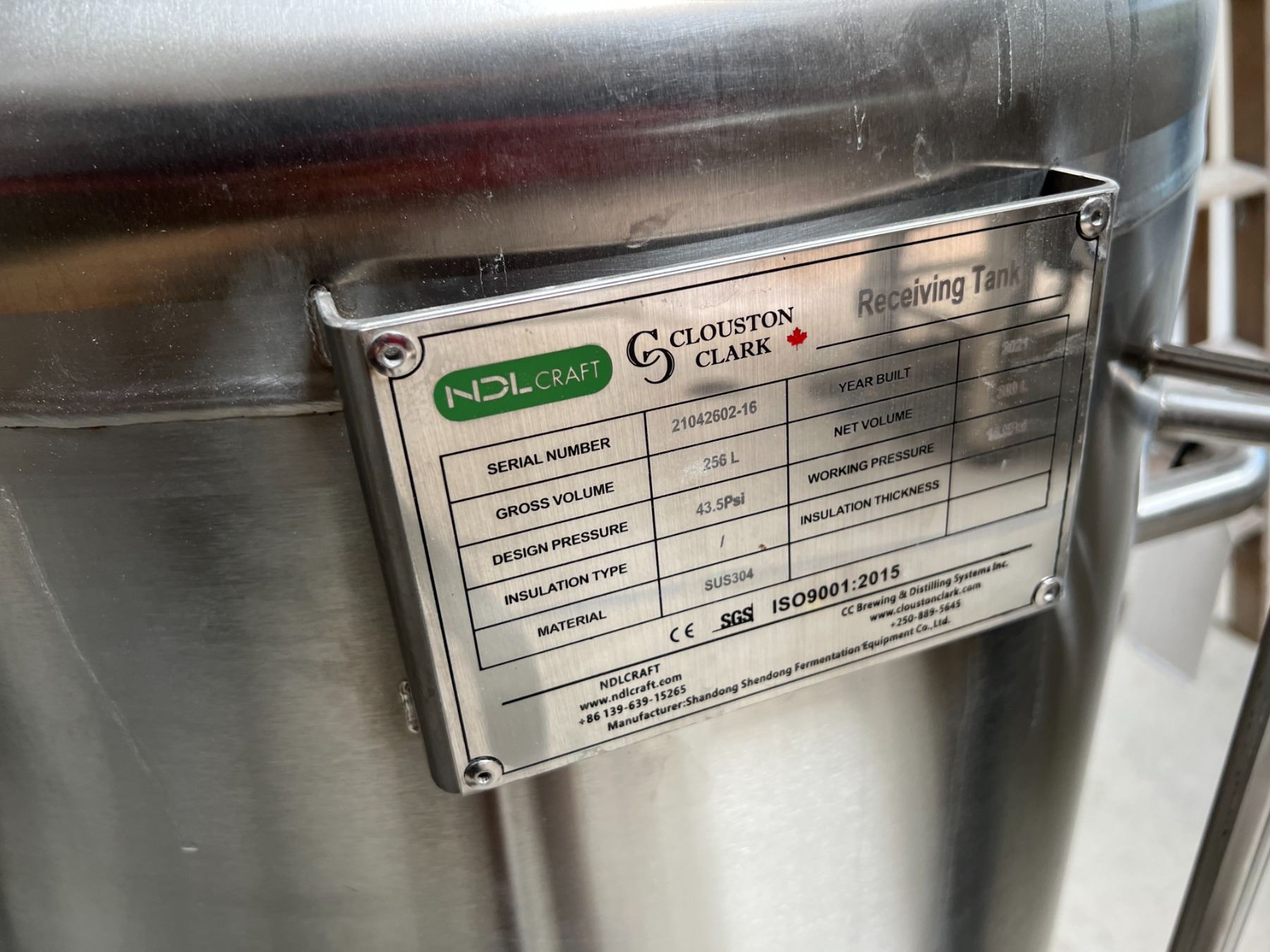NDL CRAFT 2 HECTOLITER (256 L) RECEIVING TANK PRESSURE VESSEL ON WHEELS. SINGLE LAYER, SIGHT GLASS, CIP ARM, MAN WAY