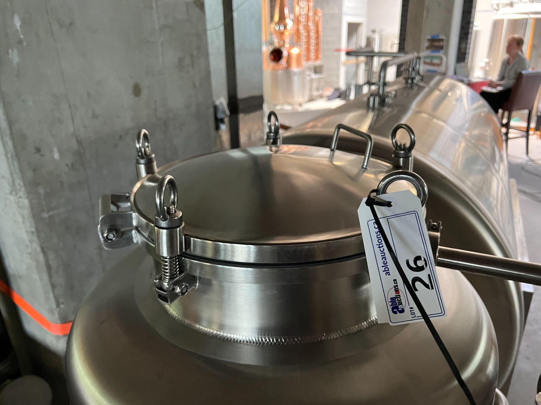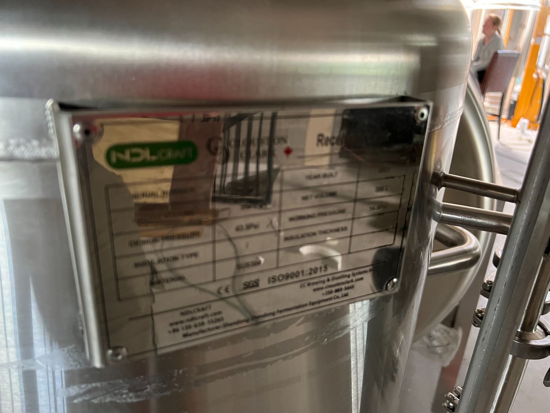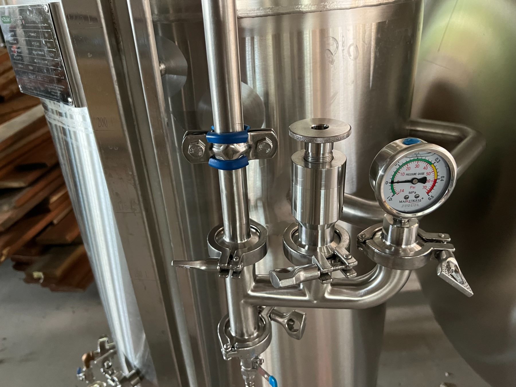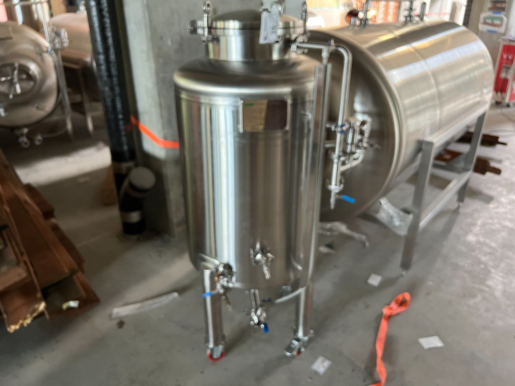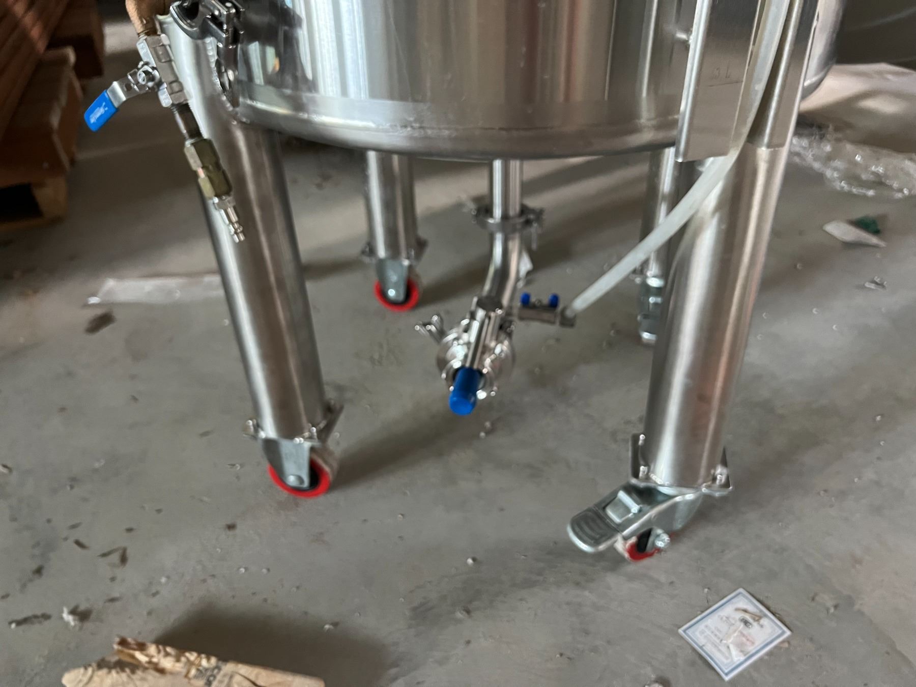 NDL CRAFT 2 HECTOLITER (256 L) RECEIVING TANK PRESSURE VESSEL ON WHEELS. SINGLE LAYER, SIGHT GLASS, PRESSURE GAUGE, SAMPLE VALVE, BUNGE DEVICE