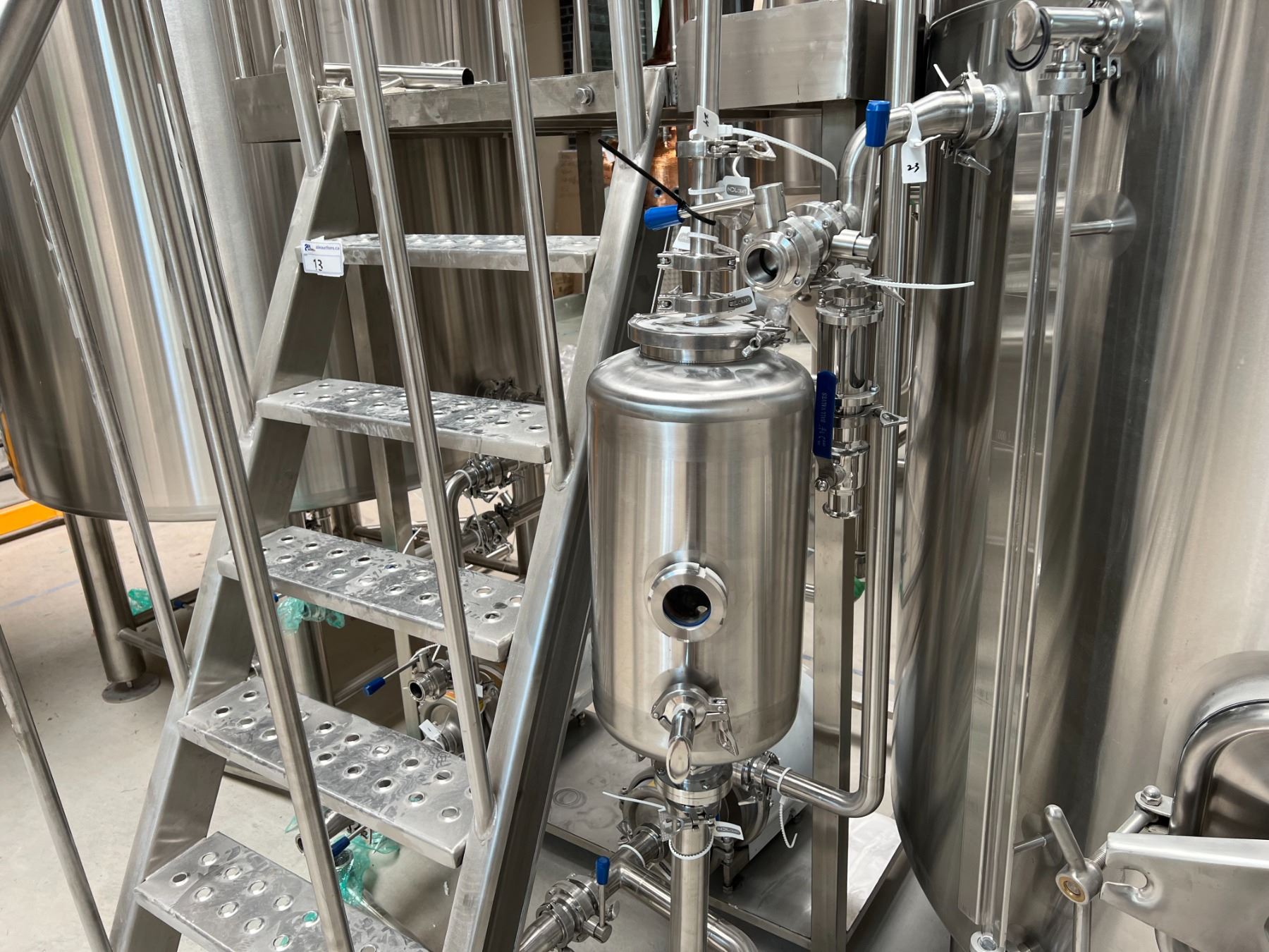 NDL CRAFT BREWHOUSE WITH KETTLE, MASH/LAUTER TANK, HOT WATER TANK, DIGITAL CONTROLS. CC BREWING AND DISTILLING SYSTEMS INC CLOUSTON CLARK.COM. COMBI VESSEL BREWHOUSE. MASH TUN UPPER WITH SIGHT GLASS & LEVELING GAUGE. V WIRE FALSE BOTTOM LOWER HLT WITH LEVEL GAUGE. STEAM JACKETED. KETTLE LIGHT. ELECTRIC CONTROL PANEL. SYSTEM CIP 2 SANITARY PUMPS. FLOW METERS. 10 H LITRE (PLUS 25% OVER CAP) KETTLE- STEAM JACKETED WITH HOP STRAINER INCLUDES 2 PHASE HEAT EXCHANGE. WITH HOT WATER RECOVERY, FLOW METER, COLD WATER GLYCOL COOLING. INCLUDES YEAST PITCH INJECTOR WITH SIGHT GLASS AND OXYGENATION STONE