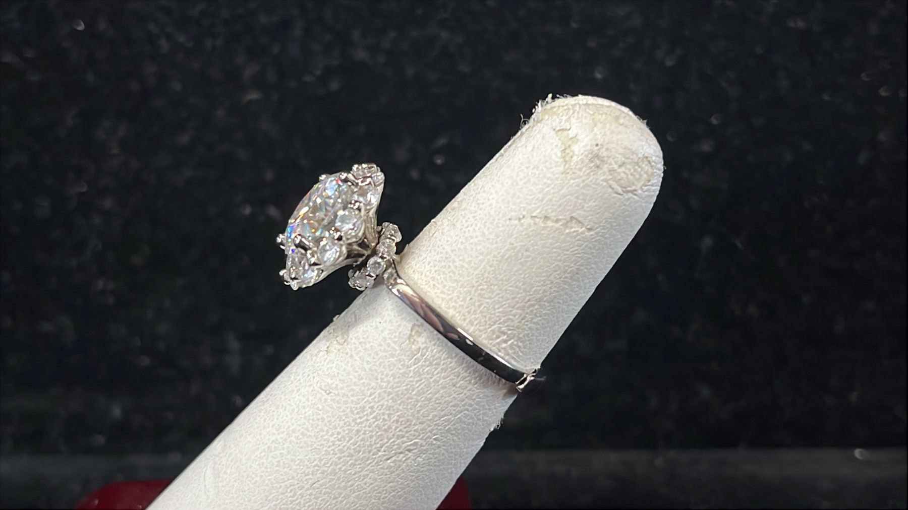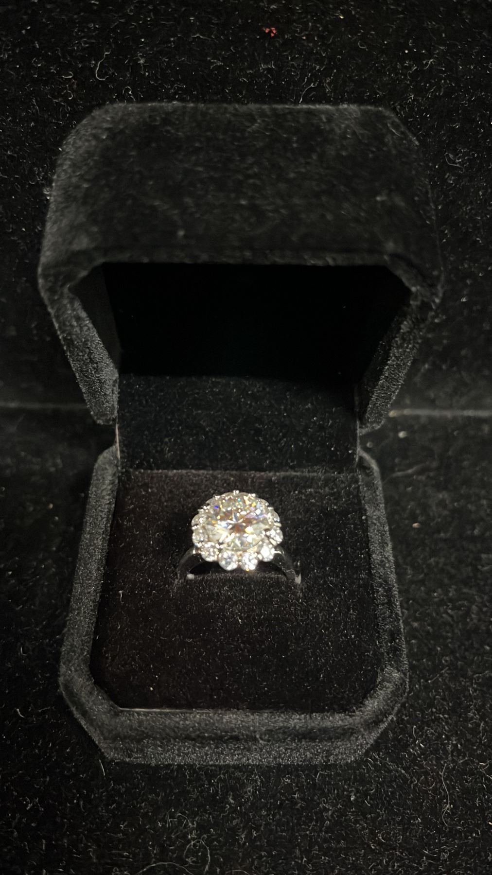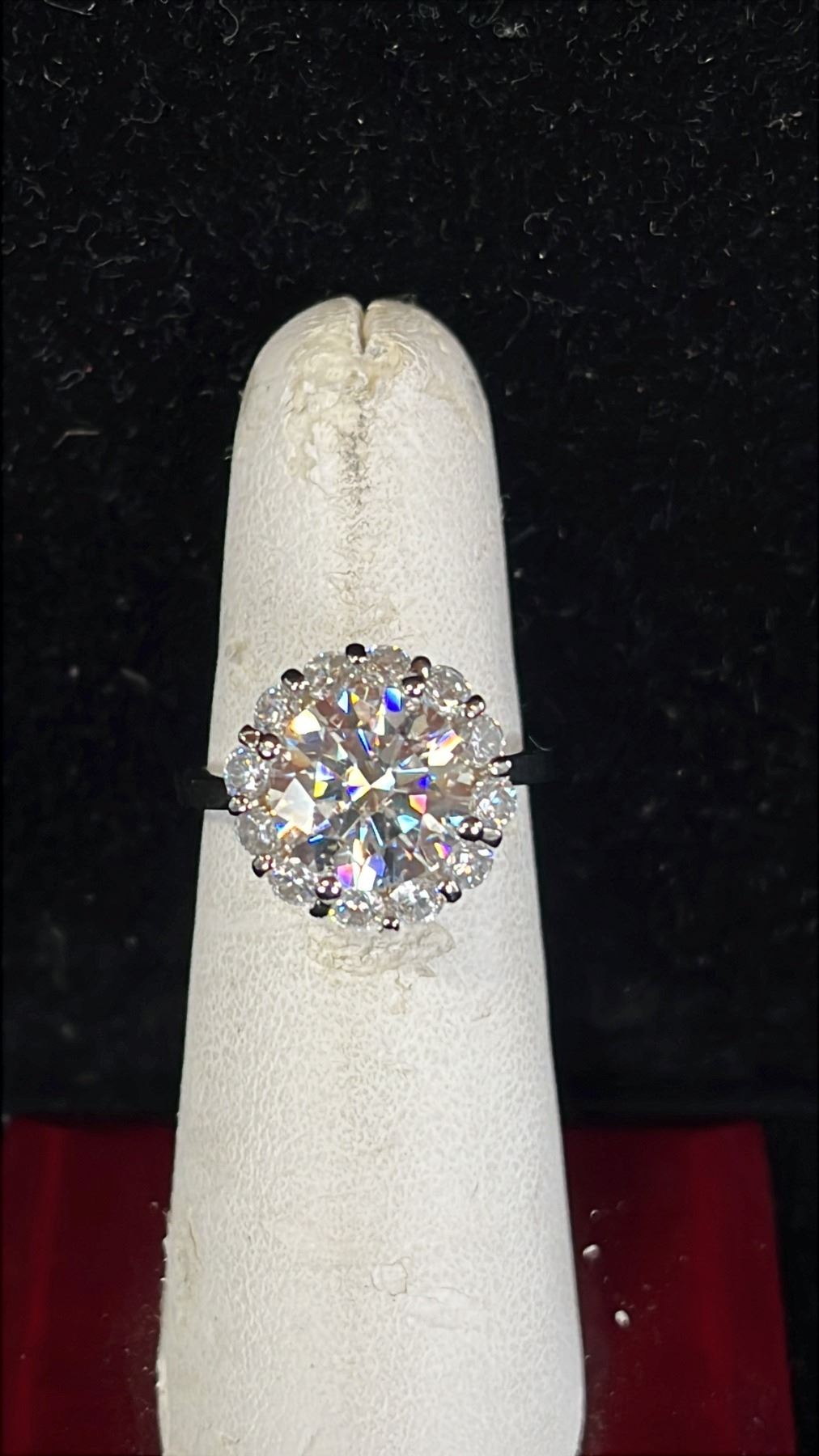 NEW 925 SILVER 3CT MOISSANITE LAB DIAMOND HALO RING - RESIZABLE MOUNTED IN 925 STERLING SILVER WITH WHITE GOLD OVERLAY, D, VVS1 TESTS POSITIVE WITH A DIAMOND TESTER