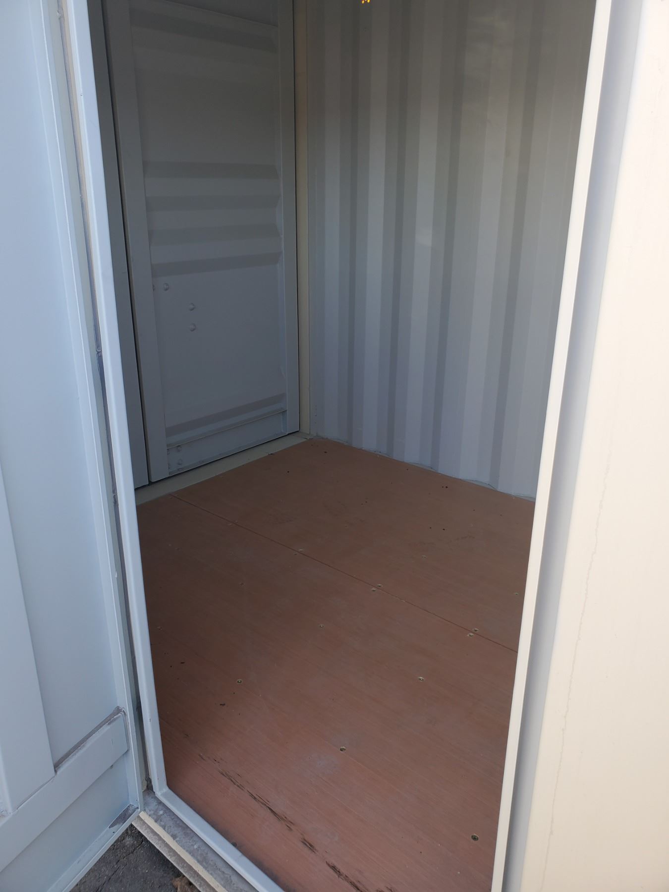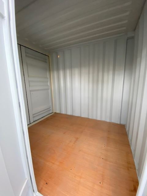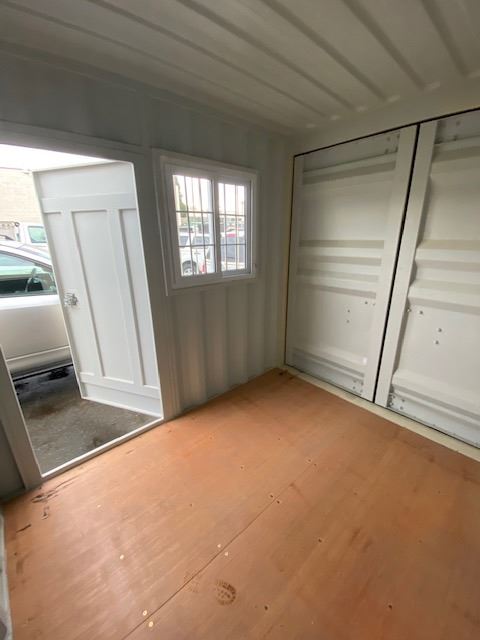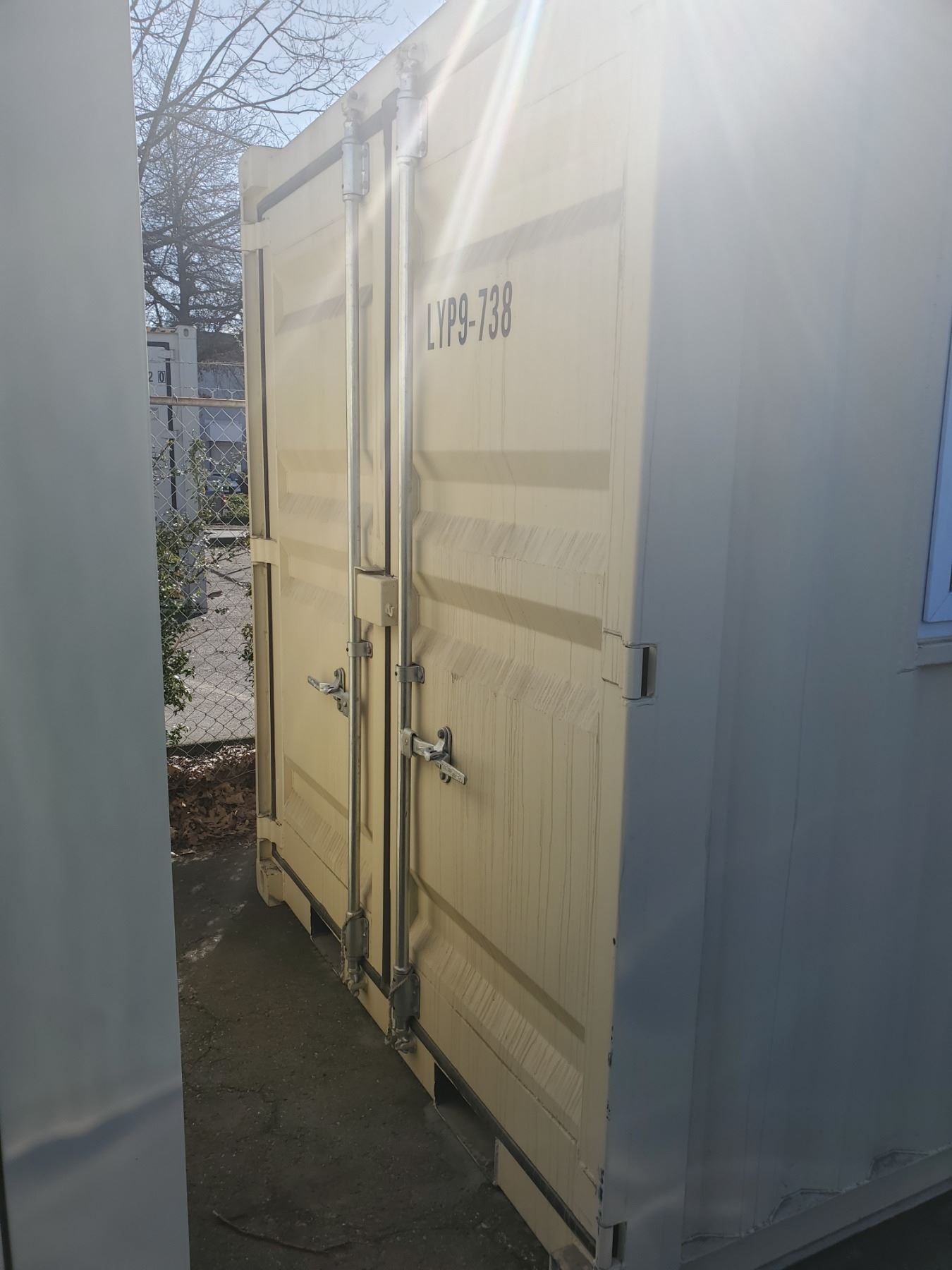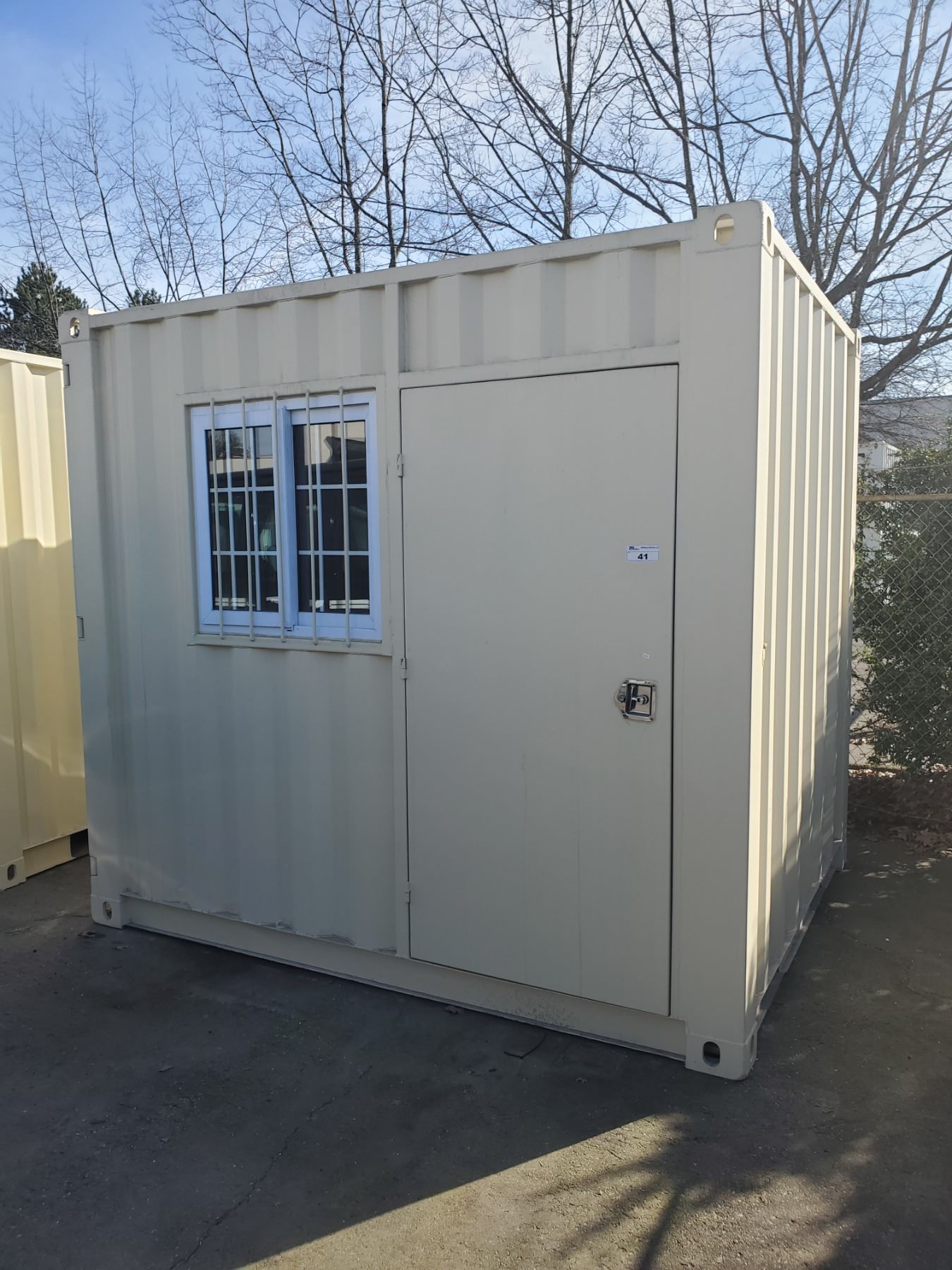 NEW 98 1/2"H X 86"W X 107"L BEIGE COMMERCIAL OFFICE SHIPPING CONTAINER WITH SIDE MAN DOOR, BARED WINDOW & DUAL REAR SWING DOORS WITH CAM LOCKS