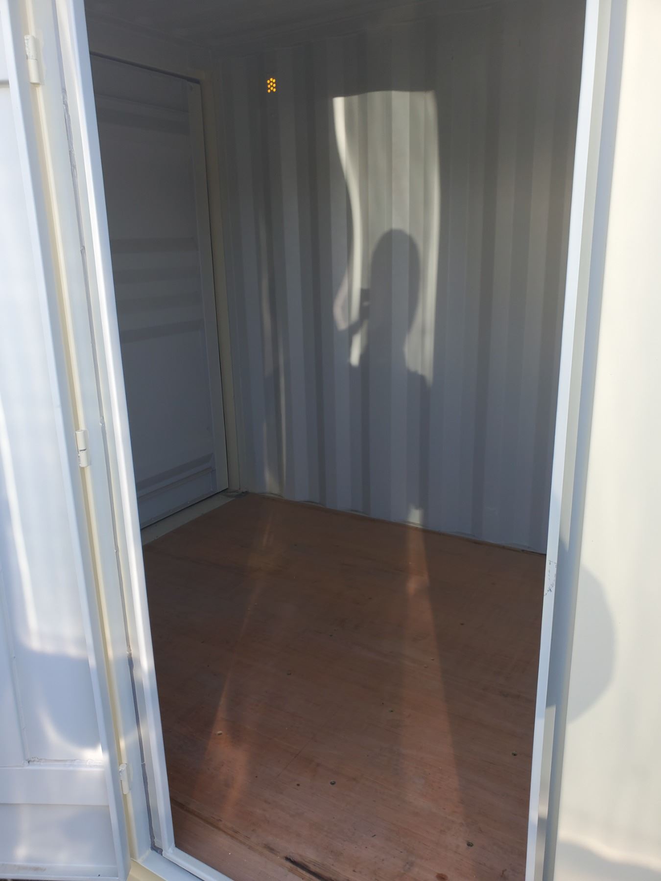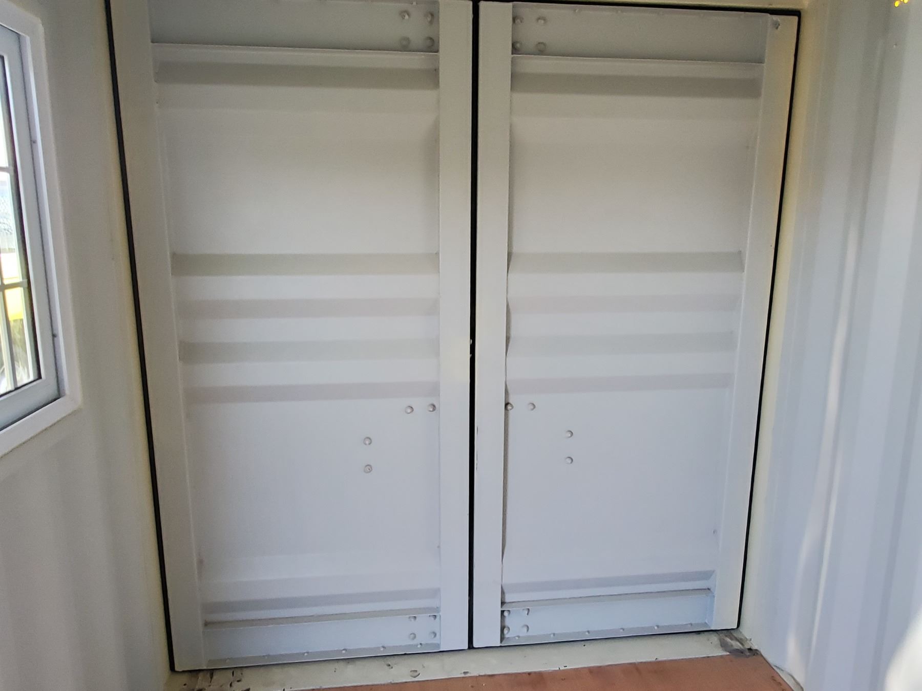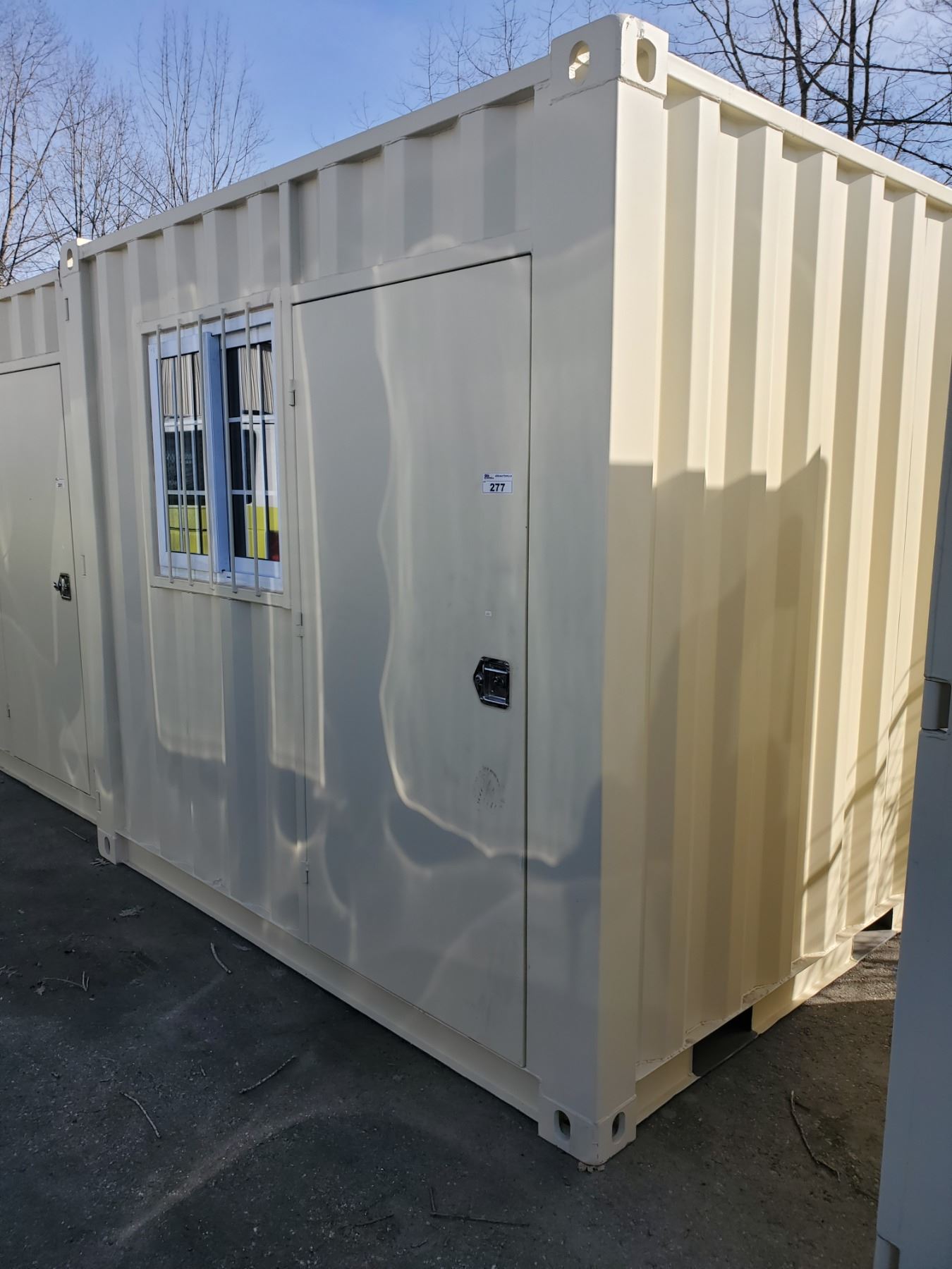 NEW 98 1/2"H X 86"W X 107"L BEIGE COMMERCIAL OFFICE SHIPPING CONTAINER WITH SIDE MAN DOOR, BARED WINDOW & DUAL REAR SWING DOORS WITH CAM LOCKS