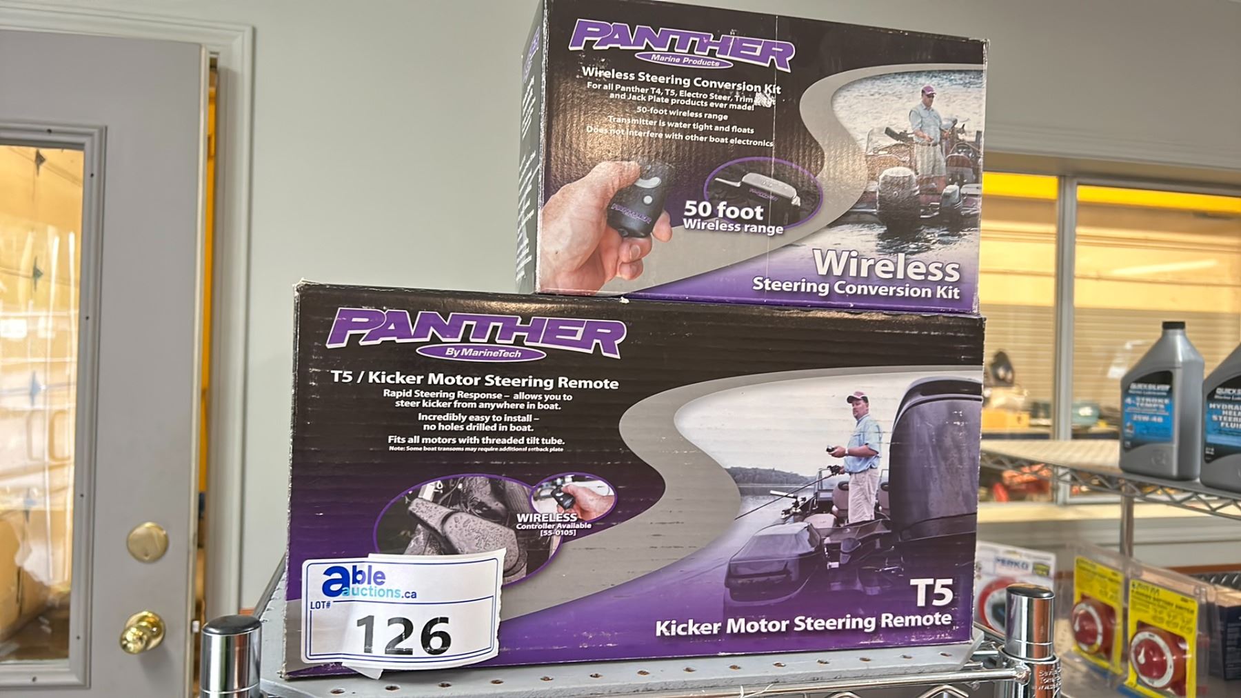 NEW IN BOX PANTHER WIRELESS STEERING CONVERSION KIT AND MODEL T5 KICKER MOTOR STEERING REMOTE