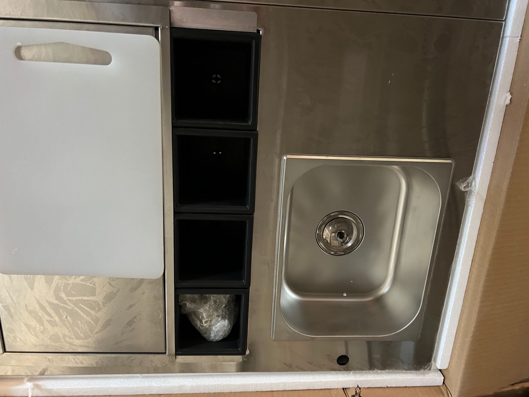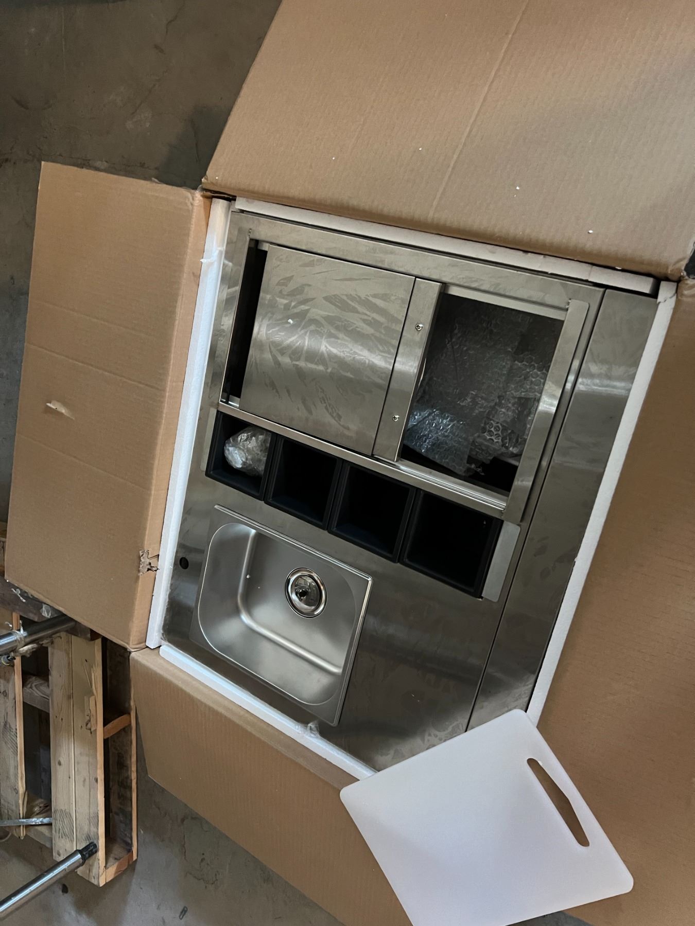 NEW IN-BOX STAINLESS PREP OR SERVING STATION COUNTERTOP MOUNTABLE. INC CUTTING BOARD ETC 30X26"