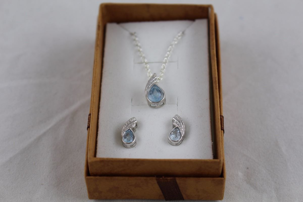 NEW MATCHING BLUE TOPAZ AND DIAMOND EARRING / NECKLACE SET, INCLUDES $425 CERTIFICATE