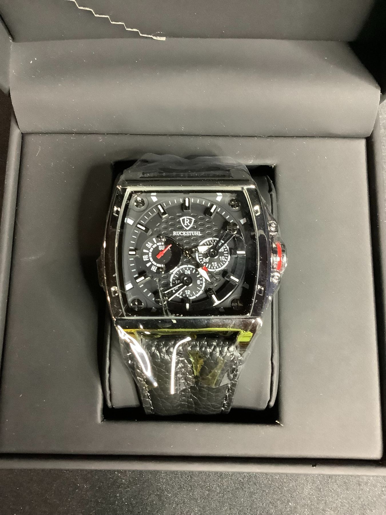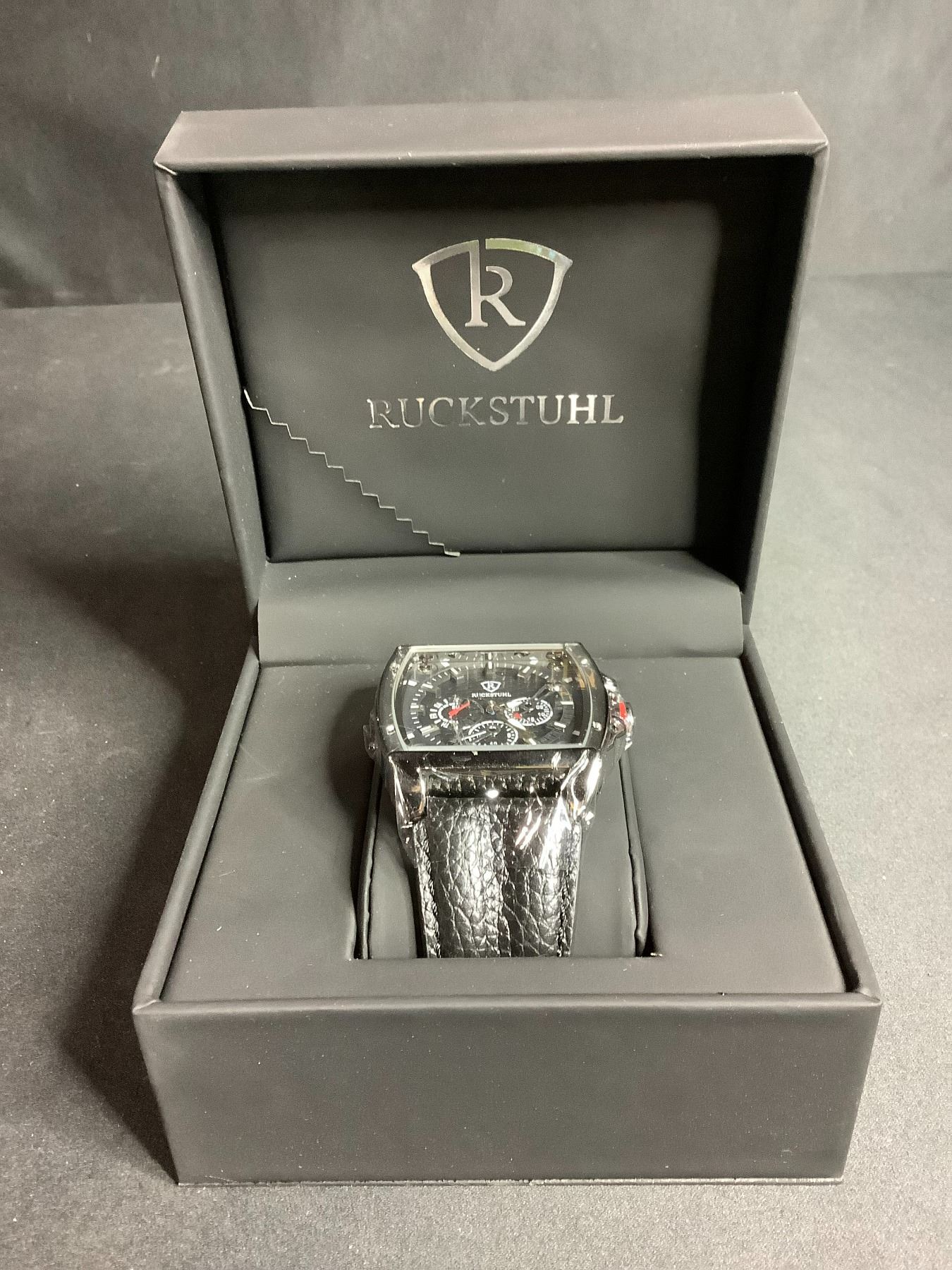 NEW MEN'S RUCKSTUHL R300 CHRONOGRAPH WATCH, BLACK MULTI-FUNCTION DIAL, 3ATM WATER RESISTANT, BLACK GENUINE LEATHER STRAP