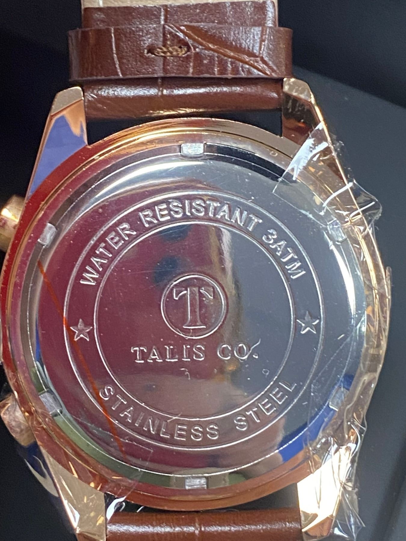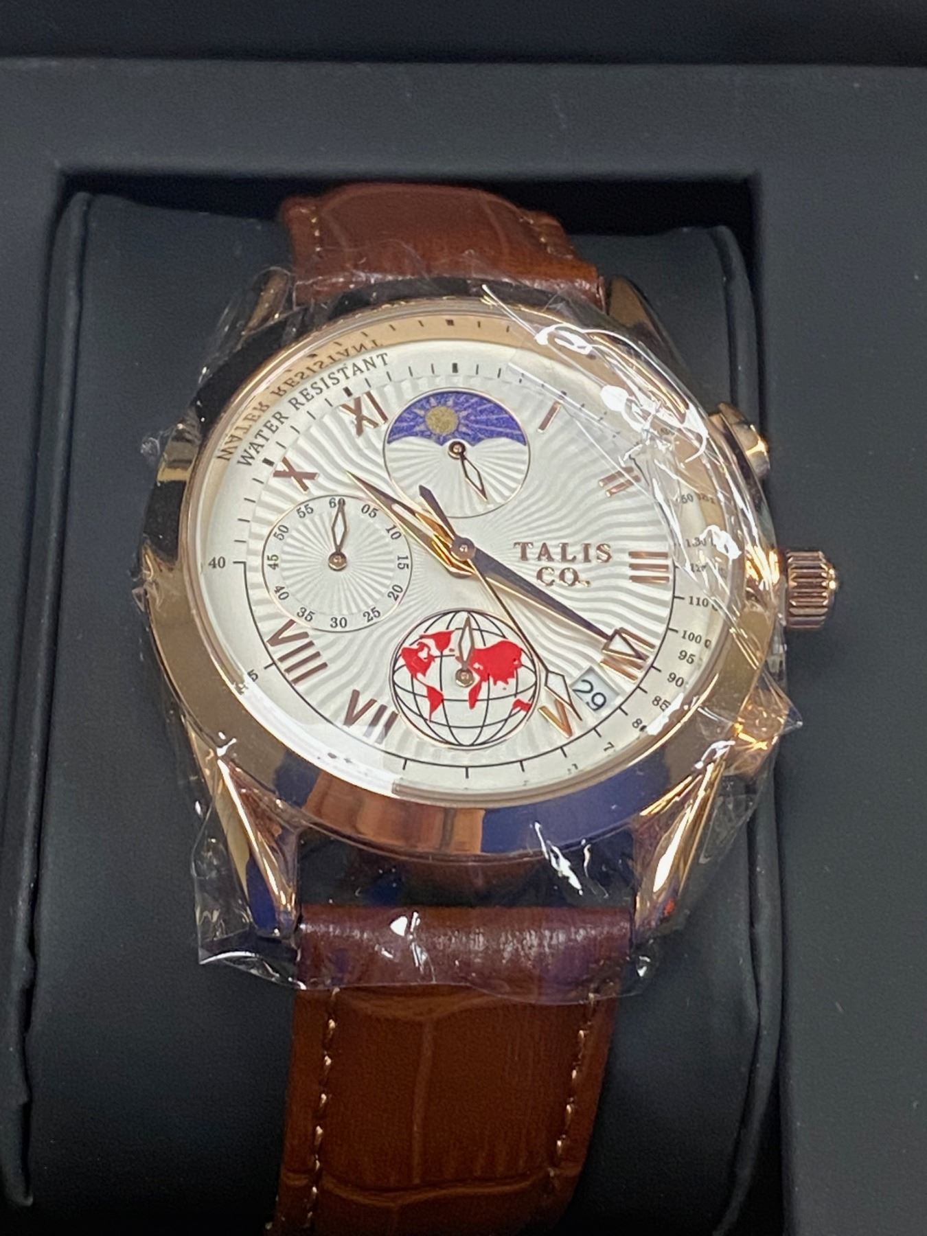 NEW MENS TALIS CO 7120 CHRONOGRAPH WATCH, MOON PHASE MOVEMENT, GENUINE LEATHER STRAP