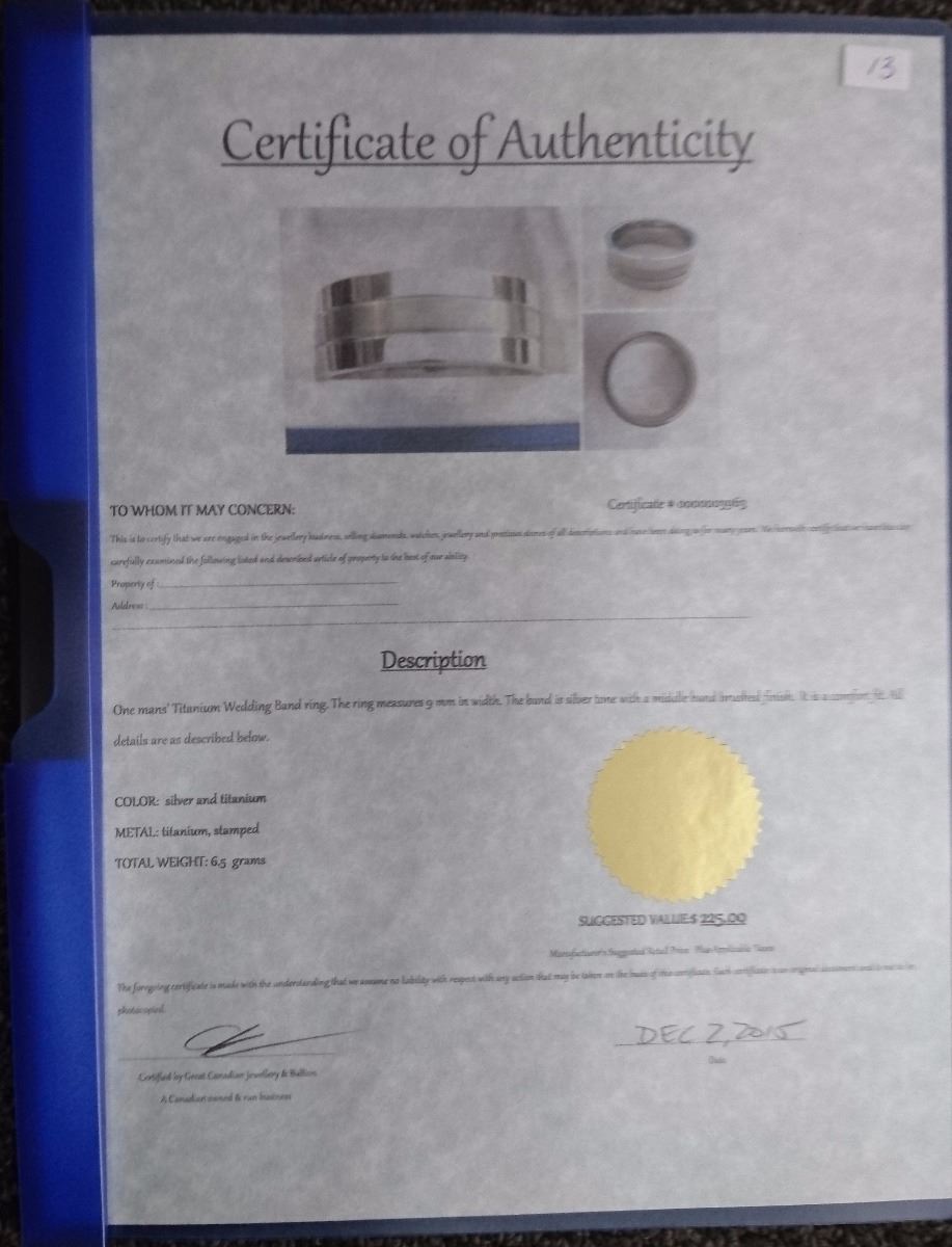 NEW MENS TITANIUM BAND RING. 9MM WIDE. SMOOTH COMFORT FIT. INCLUDES $225 CERTIFICATE