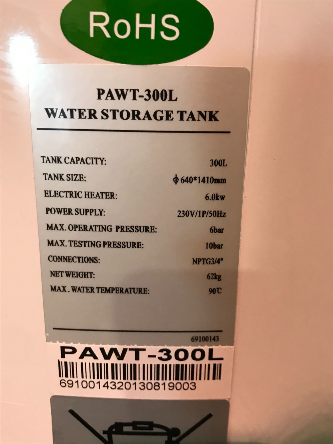 NEW ROHS PAWT-300L WATER STORAGE TANK, POWER SUPPLY 230V/1P/50HZ MAX WATER TEMPERATURE 90 C