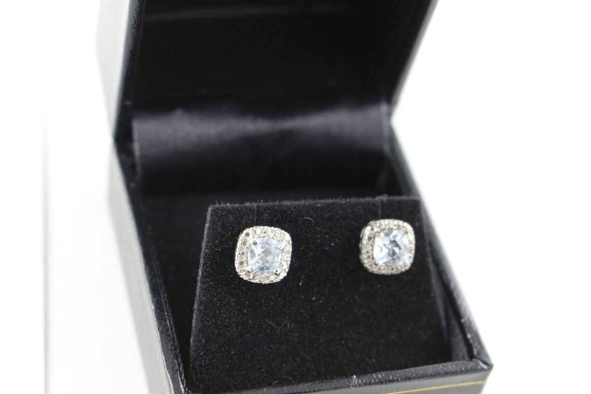 NEW SQUARE CHECKERBOARD CUT BLUE TOPAZ AND DIAMOND EARRINGS. POST AND BUTTERFLY BACKS, STERLING SILVER, RETAIL VALUE $225