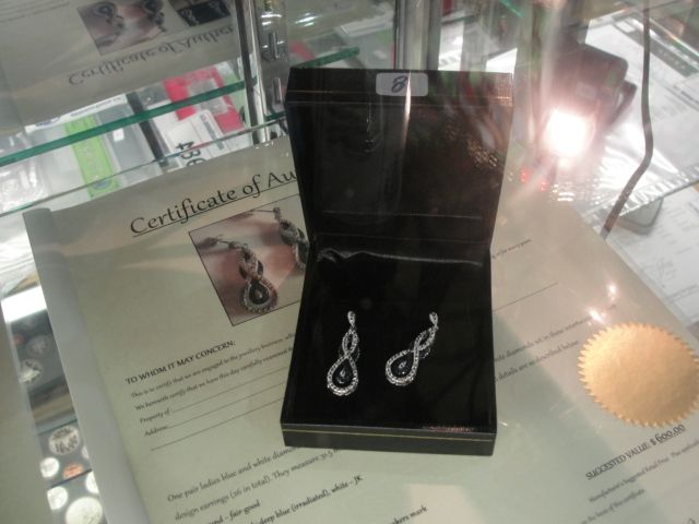 NEW WHITE AND BLUE DIAMOND .27CARAT DROP EARRINGS. SET WITH 26 DIAMONDS. INCLUDES $600 CERTIFICATE