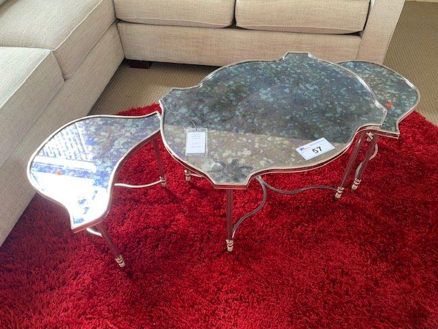 NICKEL & ANTIQUE GLASS 3 PIECE NESTING TABLE SET