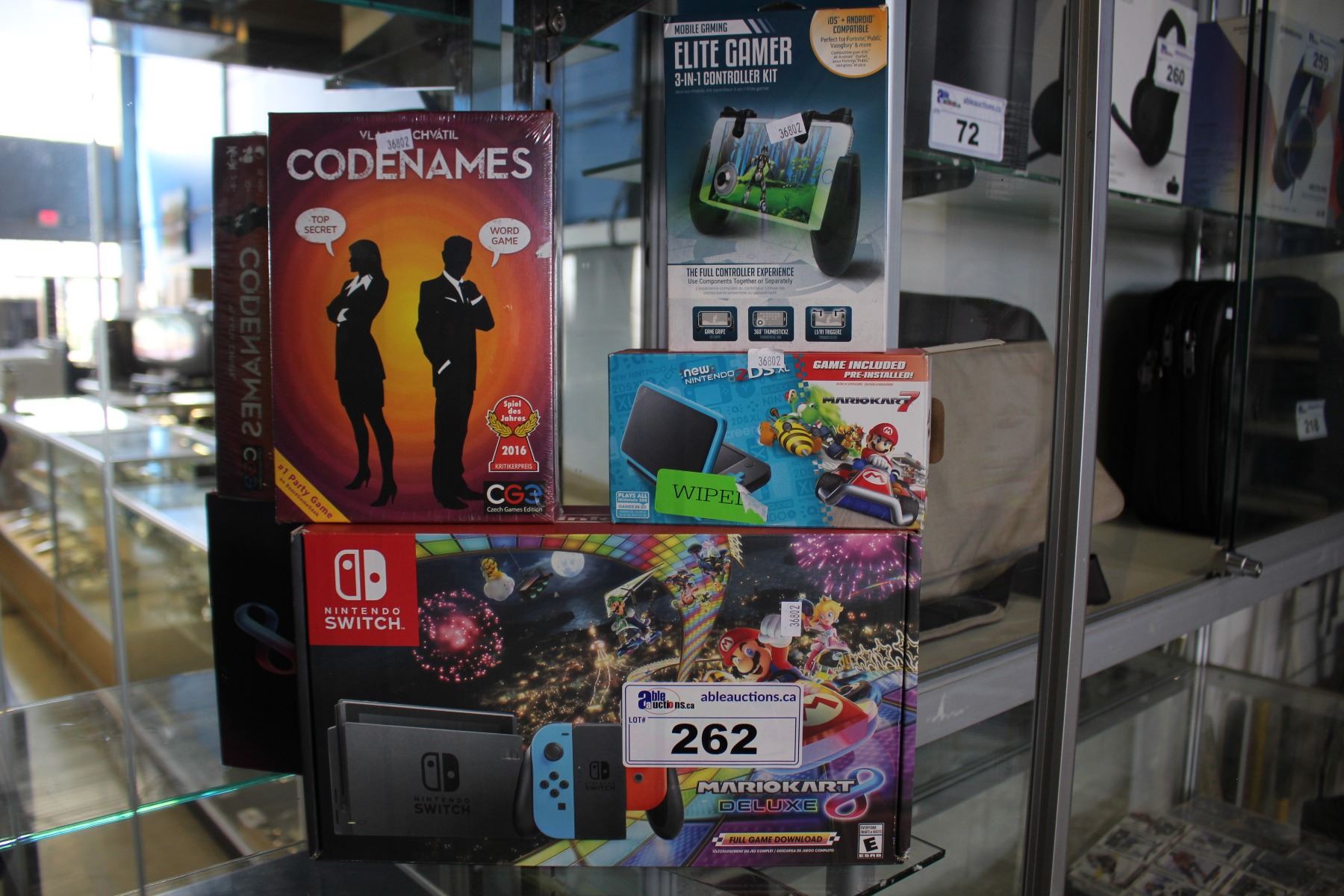 NINTENDO SWITCH MARIO KART DELUXE PACK, NINTENDO 2DS XL MARIO KART 7 PACK, ELITE GAMER 3-IN-1 CONTROLLER KIT, AND CODENAMES CARD GAME