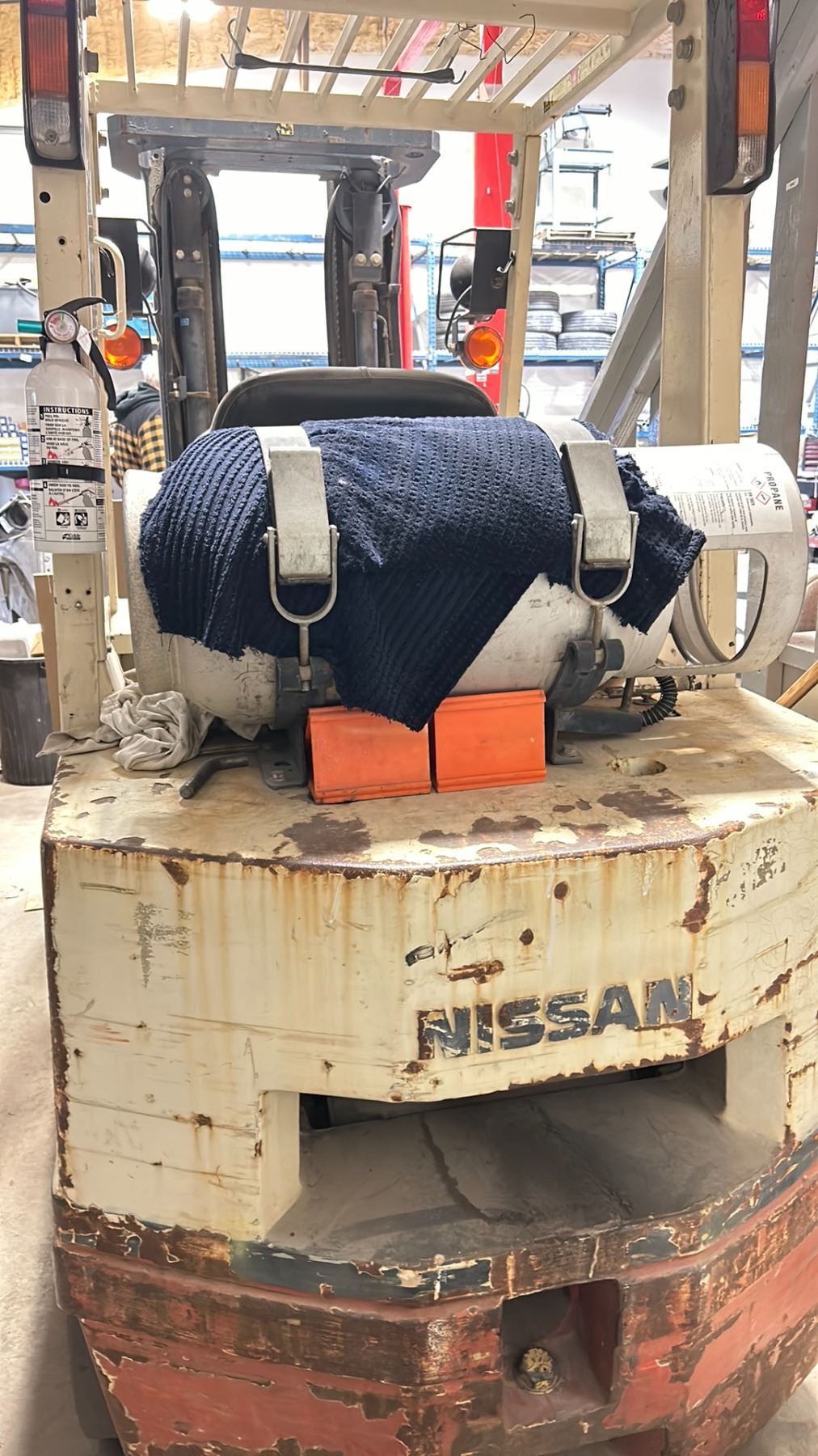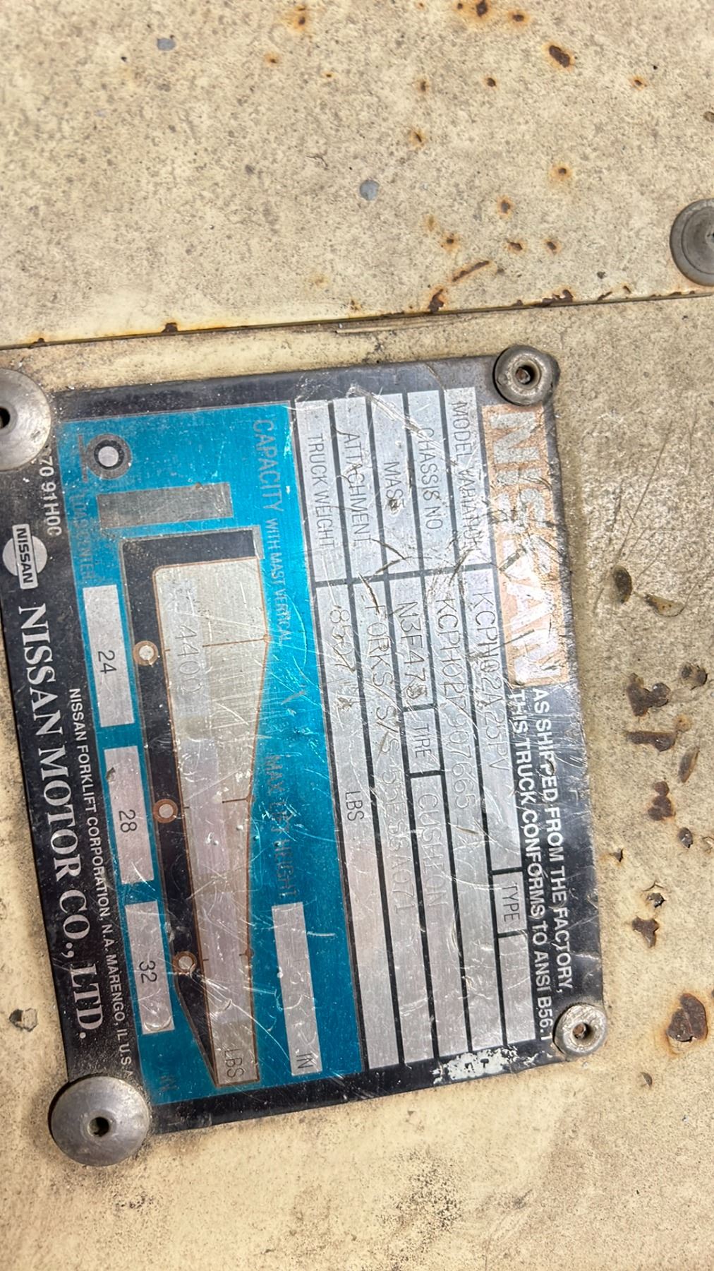 NISSAN PROPANE FORKLIFT. HAS SIDE SHIFT AND 3 STAGE LIFT. HOURS READ 5858 AT TIME OF CATALOG. *HOURS NOT VERIFIED* MODEL KCPH02A25PV. 15'6" 4400 LBS. WORKS WELL, *MUST BE PICKED UP END OF LAST DAY*
