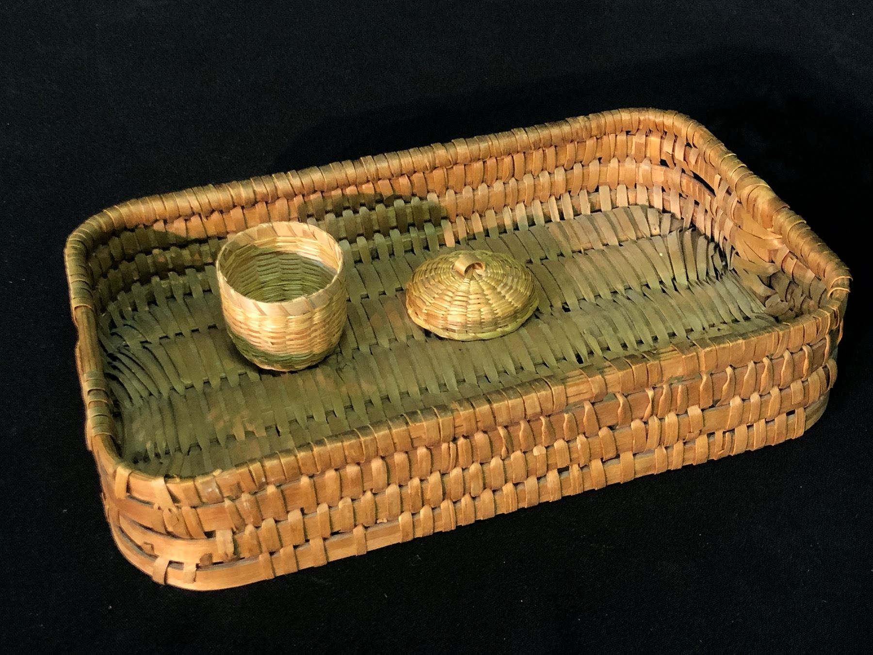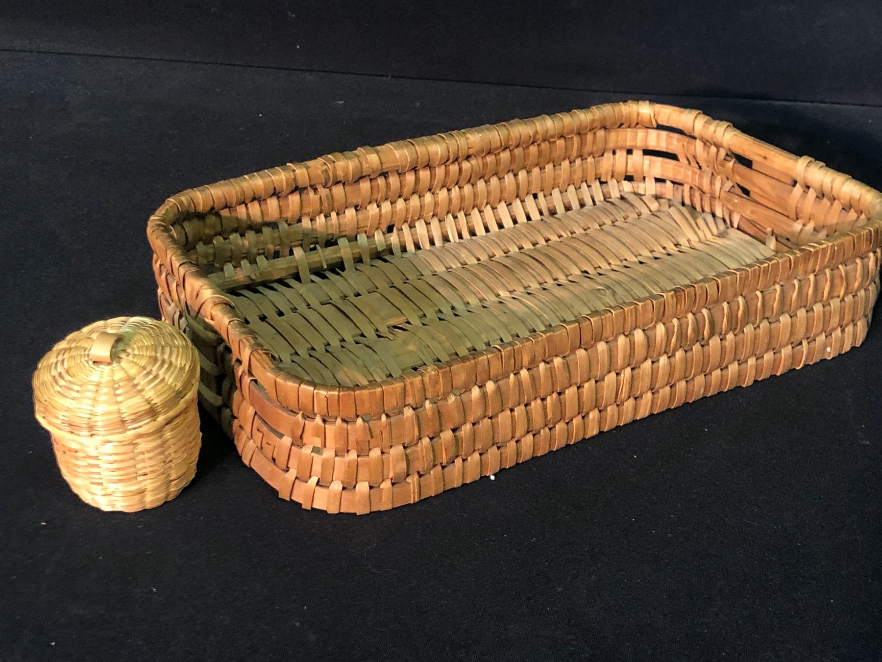 NOOTKA NATIVE HAND WOVEN BASKET, C. EARLY 1900S, APPROX. 11" WIDE, AND SMALL HAND WOVEN LIDDED