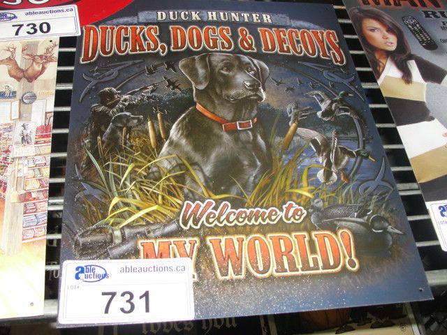 NOSTALGIC TIN ADVERTISEMENT SIGN - DUCK HUNTER, DUCKS DOGS AND DECOYS
