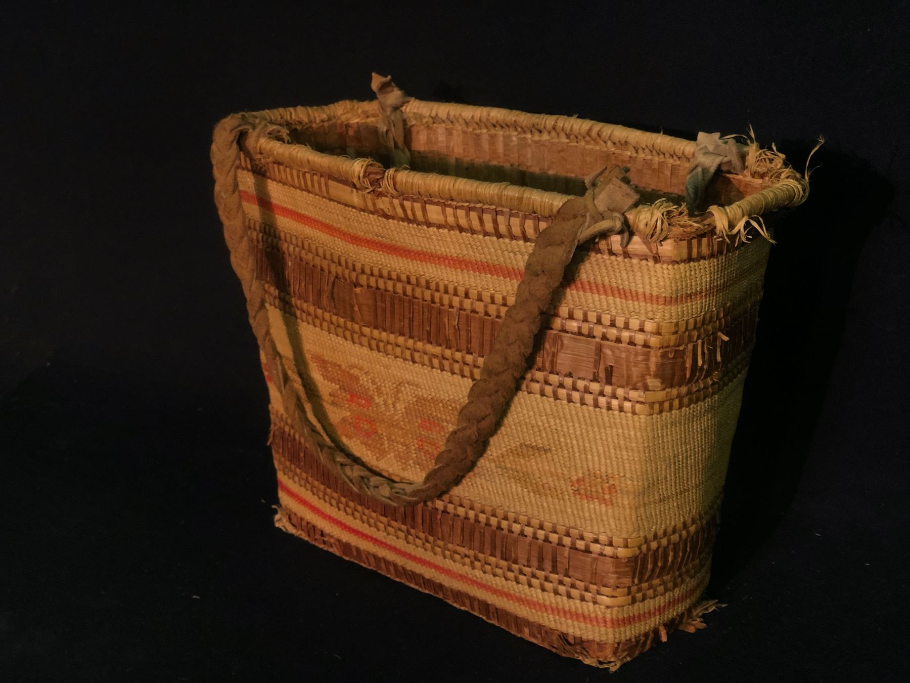 NUU-CHAH-NULTH NATIVE HAND WOVEN BIRD PATTERN SHOPPING BASKET WITH LEATHER STRAPS, 9" TALL NOT INCLUDING HANDLES