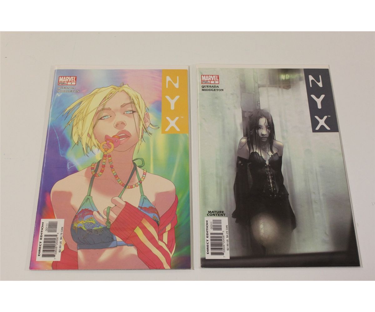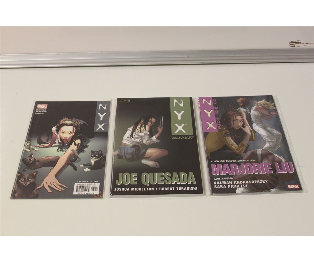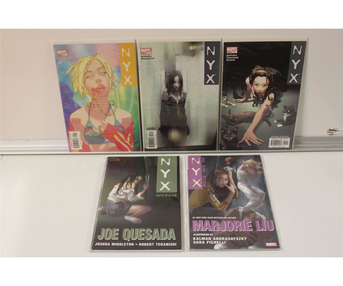 NYX. MINI SERIES #1-5 (#3 1ST APPEARANCE X-23, WOLVERINE'S DAUGHTER) & 2 DIFFERENT NYX TRADE PAPERBACKS. HIGH GRADE.