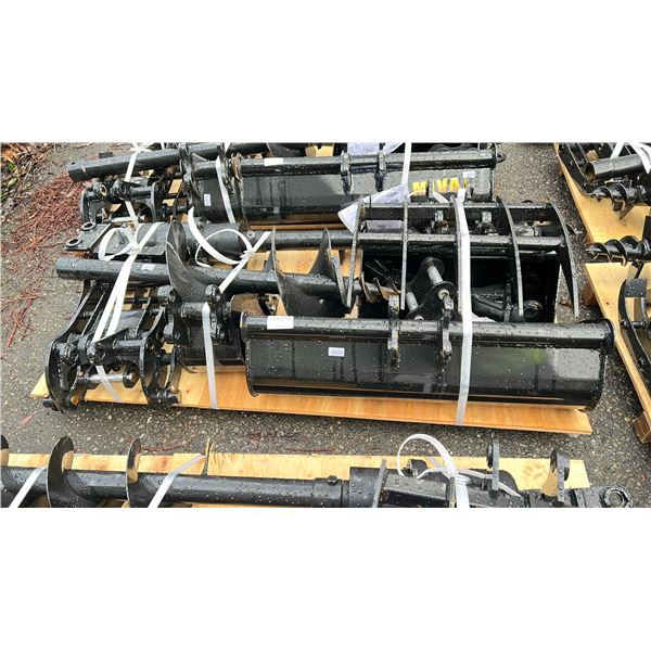 MIVA INDUSTRIAL MINI EXCAVATOR ATTACHMENT SET INCLUDING: 200MM BUCKET, 500MM BUCKET, 800MM BUCKET, QUICK HITCH, 20CM AUGER, 30CM AUGER, GRABBER, RIPPE