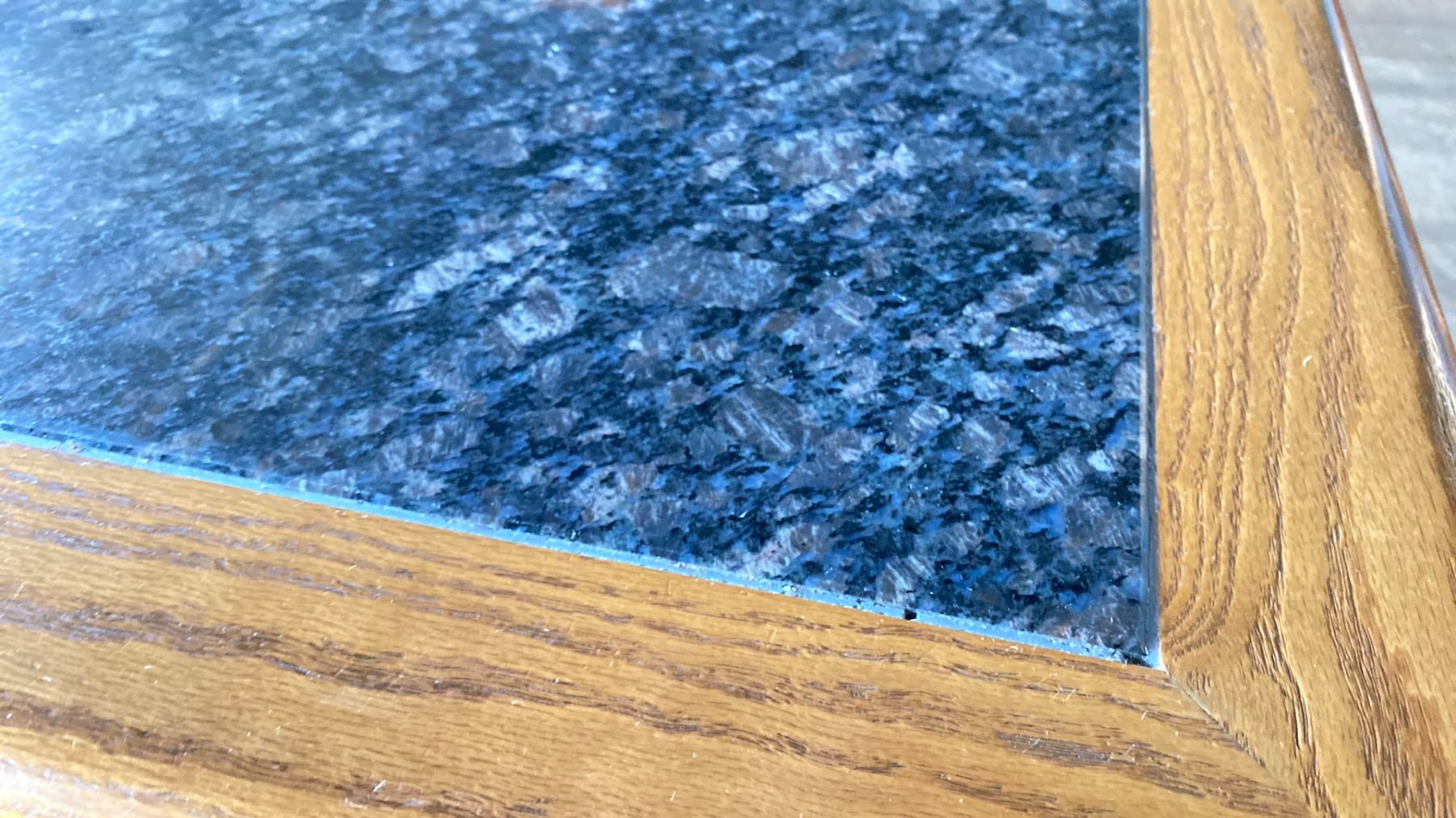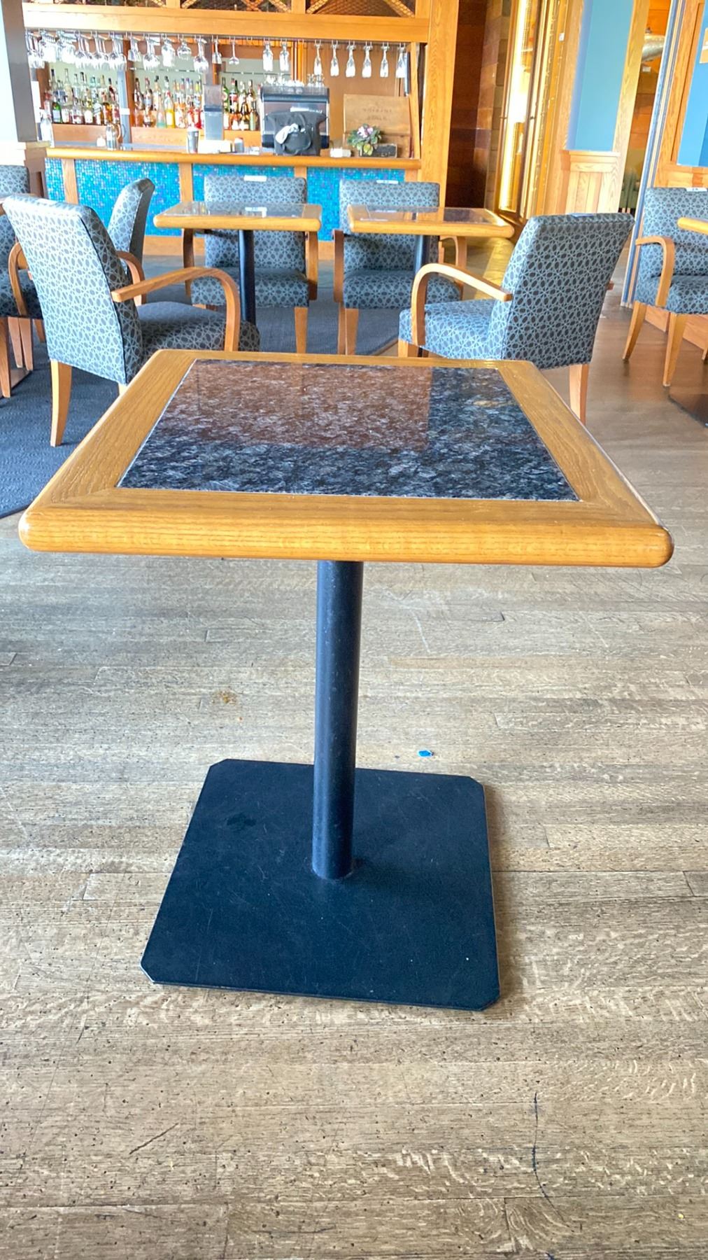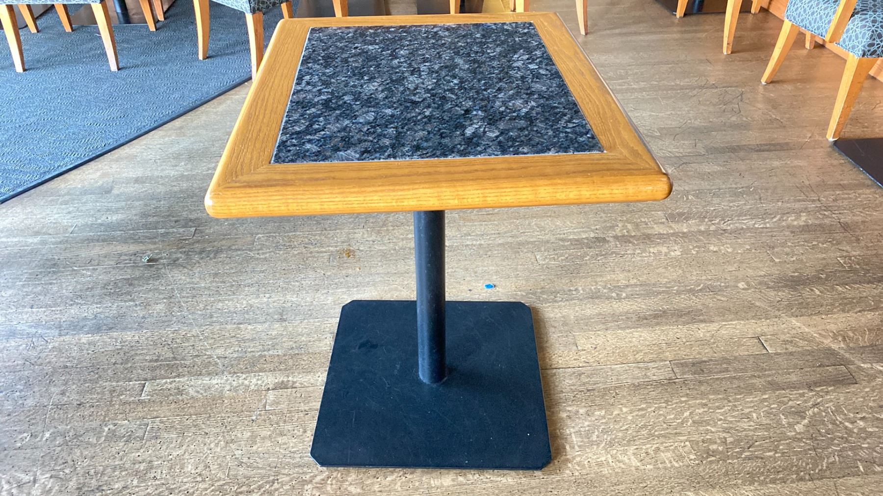 OAK AND POLISHED GRANITE TABLE TOP ON BLACK METAL PEDESTAL APPROX 29"H X 28"L X24" W