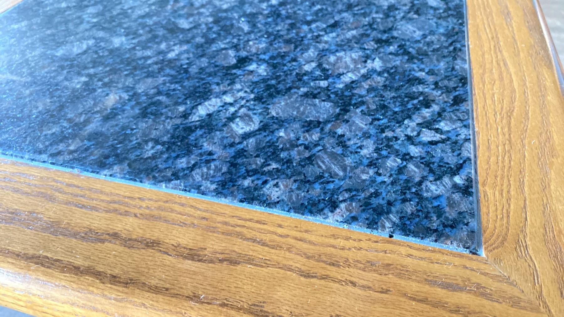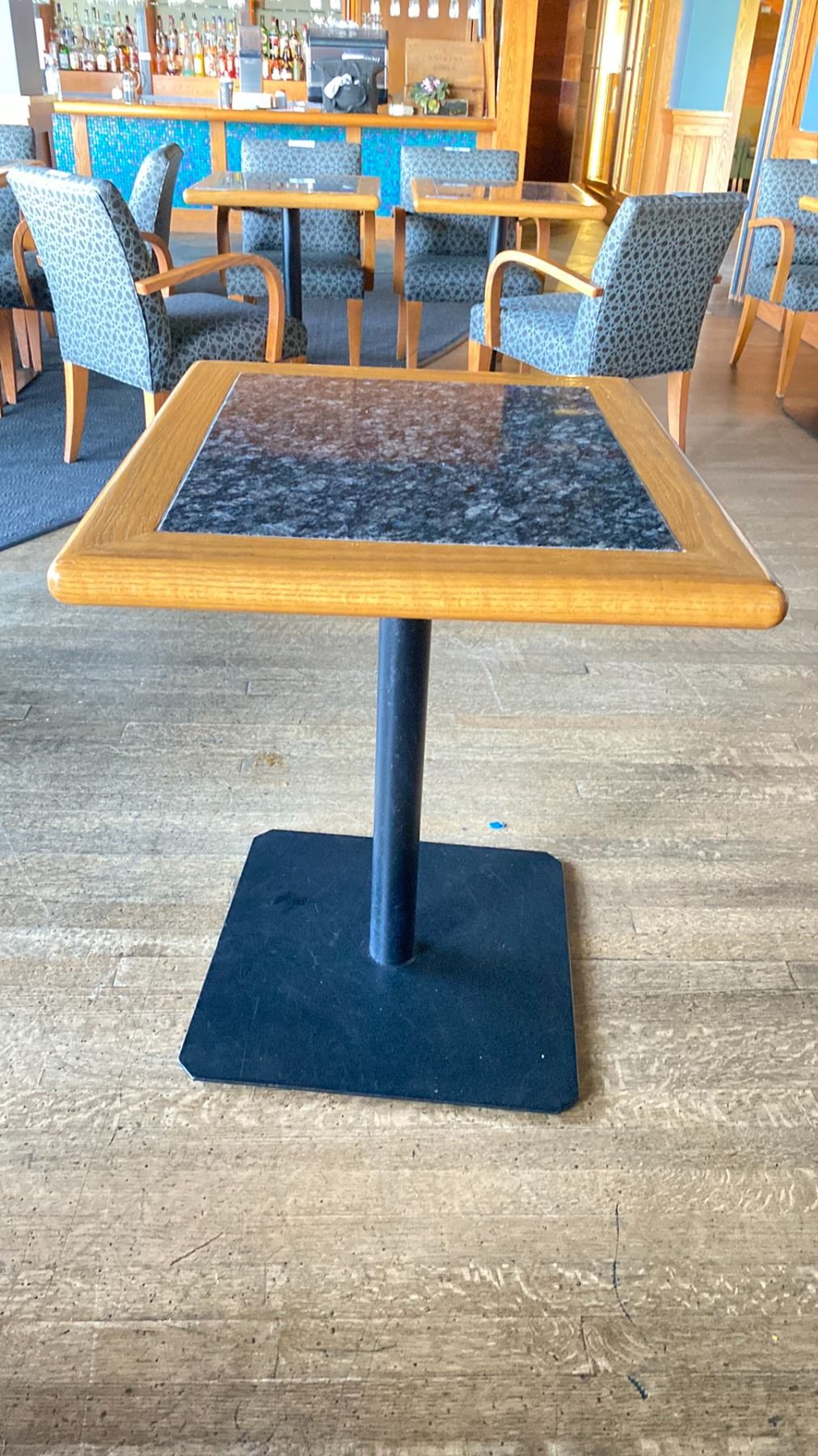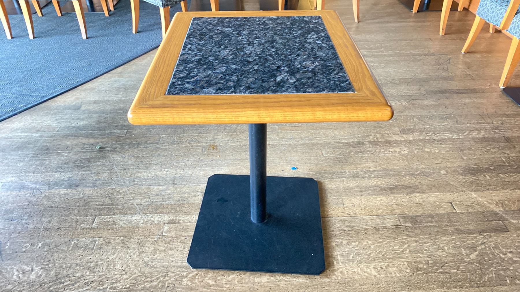 OAK AND POLISHED GRANITE TABLE TOP ON BLACK METAL PEDESTAL APPROX 29"H X 28"L X24" W