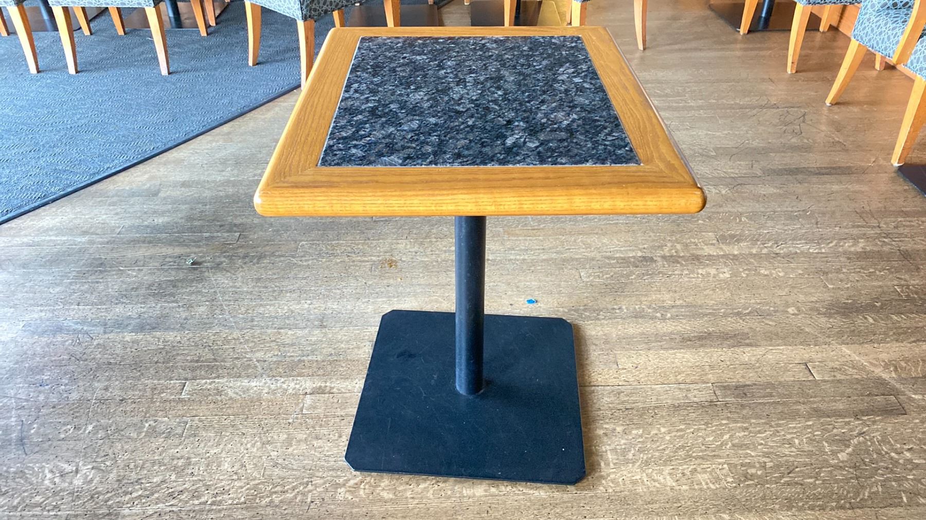 OAK AND POLISHED GRANITE TABLE TOP ON BLACK METAL PEDESTAL APPROX 29"H X 28"L X24" W