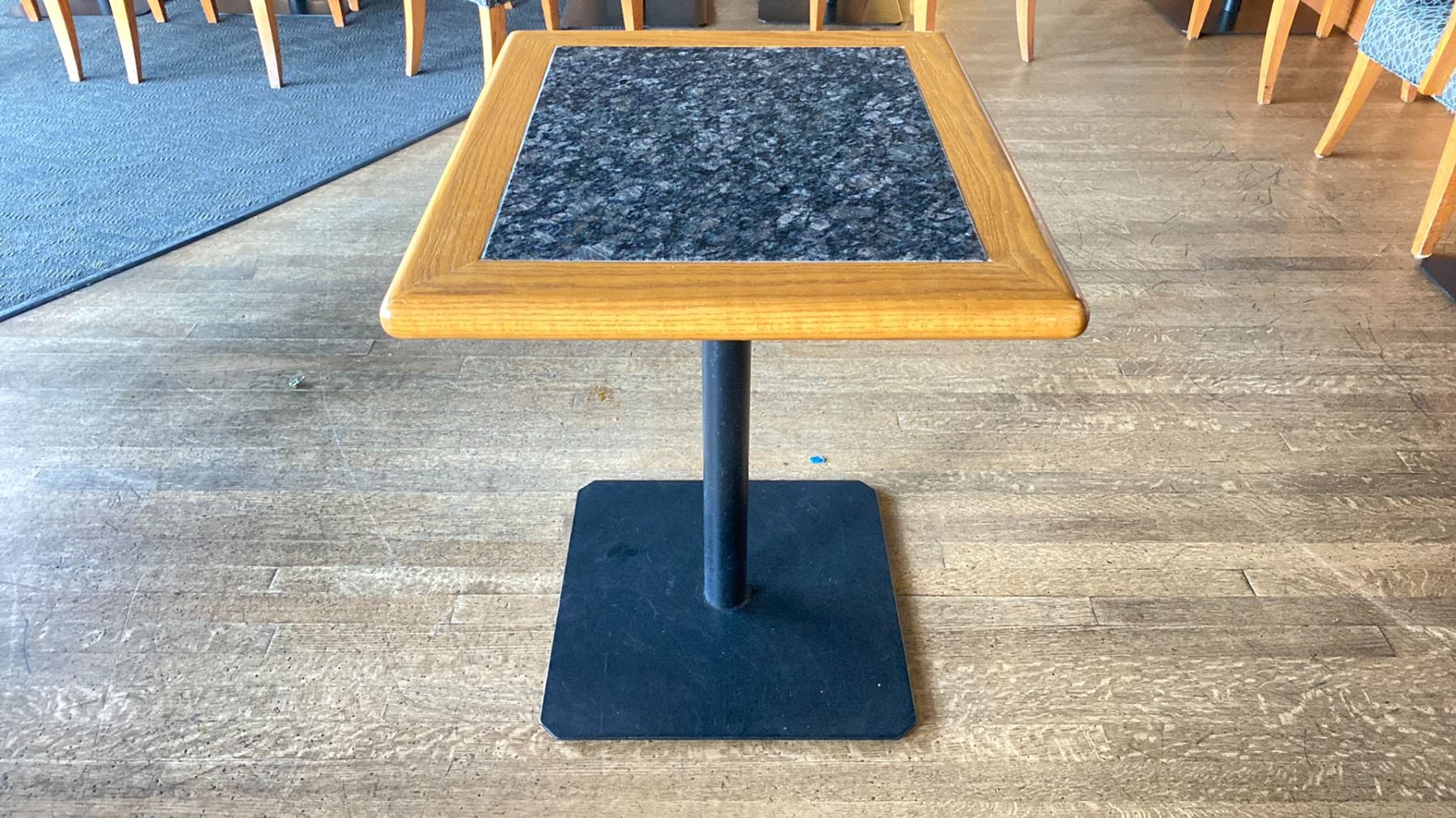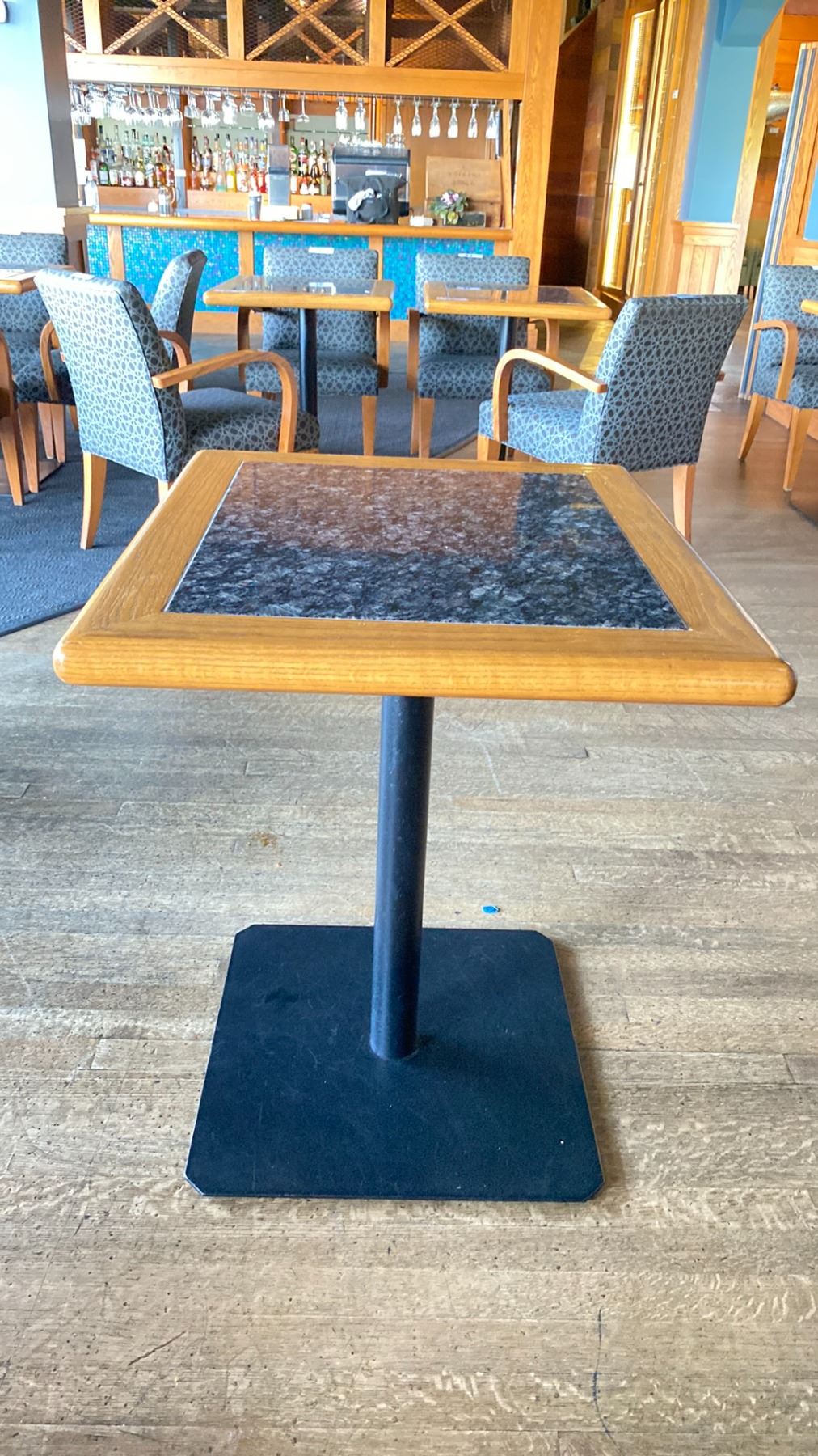 OAK AND POLISHED GRANITE TABLE TOP ON BLACK METAL PEDESTAL APPROX 29"H X 28"L X24" W