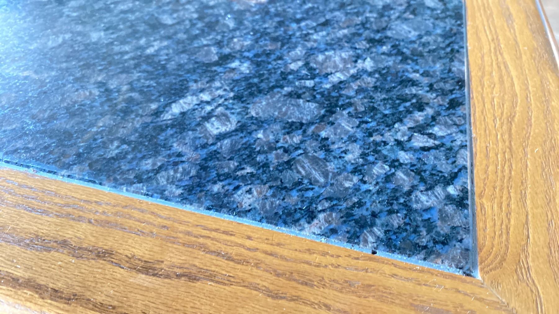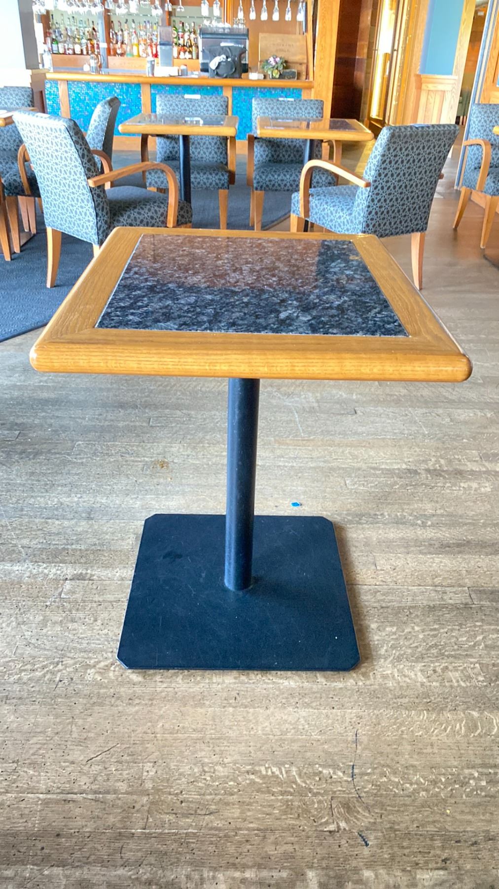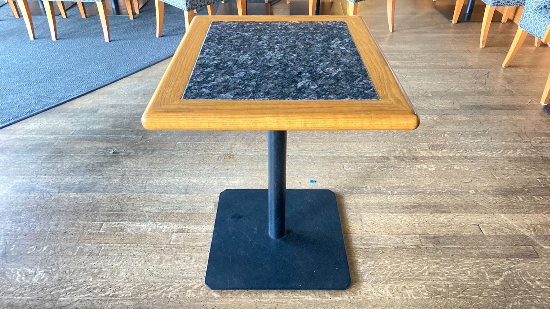 OAK AND POLISHED GRANITE TABLE TOP ON BLACK METAL PEDESTAL APPROX 29"H X 28"L X24" W