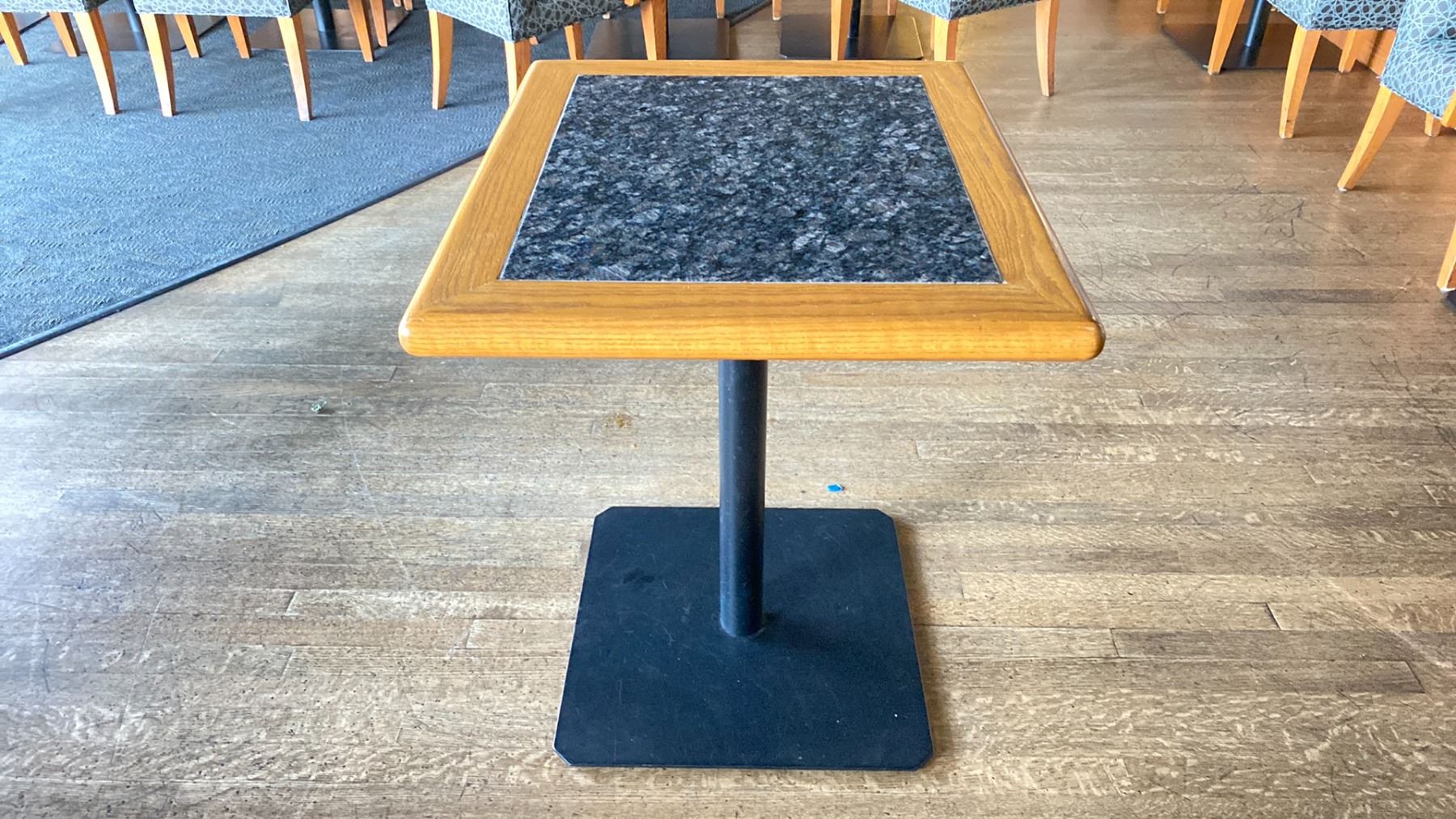 OAK AND POLISHED GRANITE TABLE TOP ON BLACK METAL PEDESTAL APPROX 29"H X 28"L X24" W