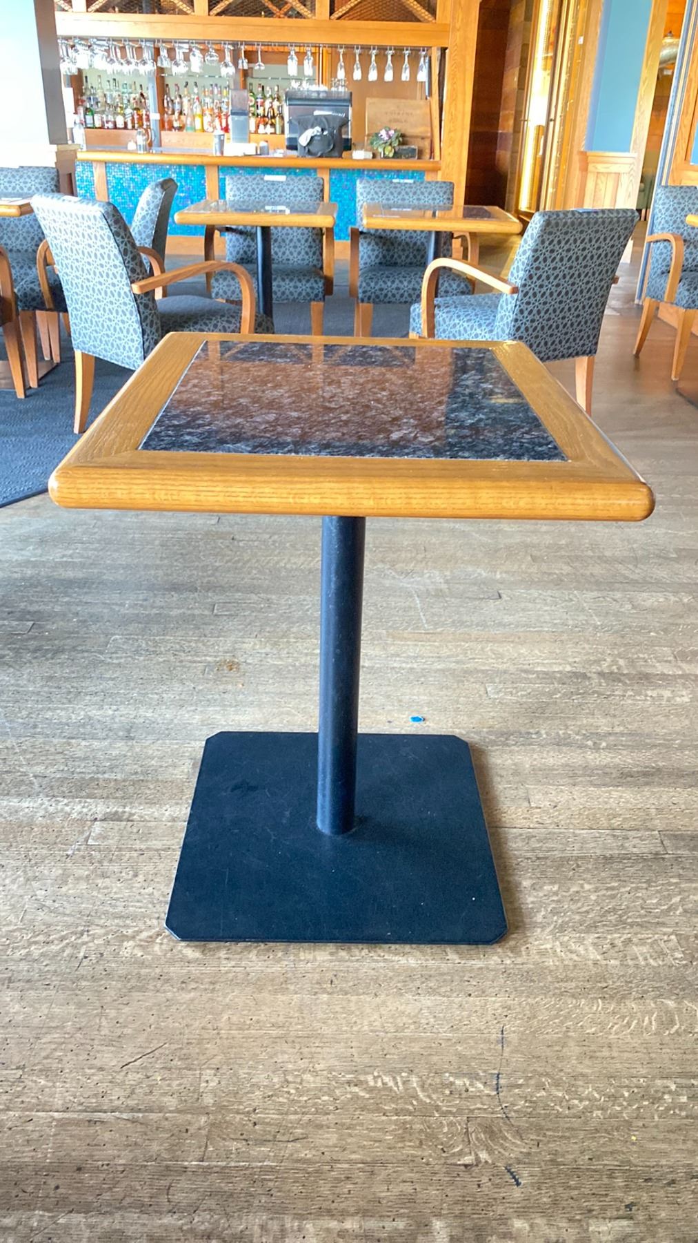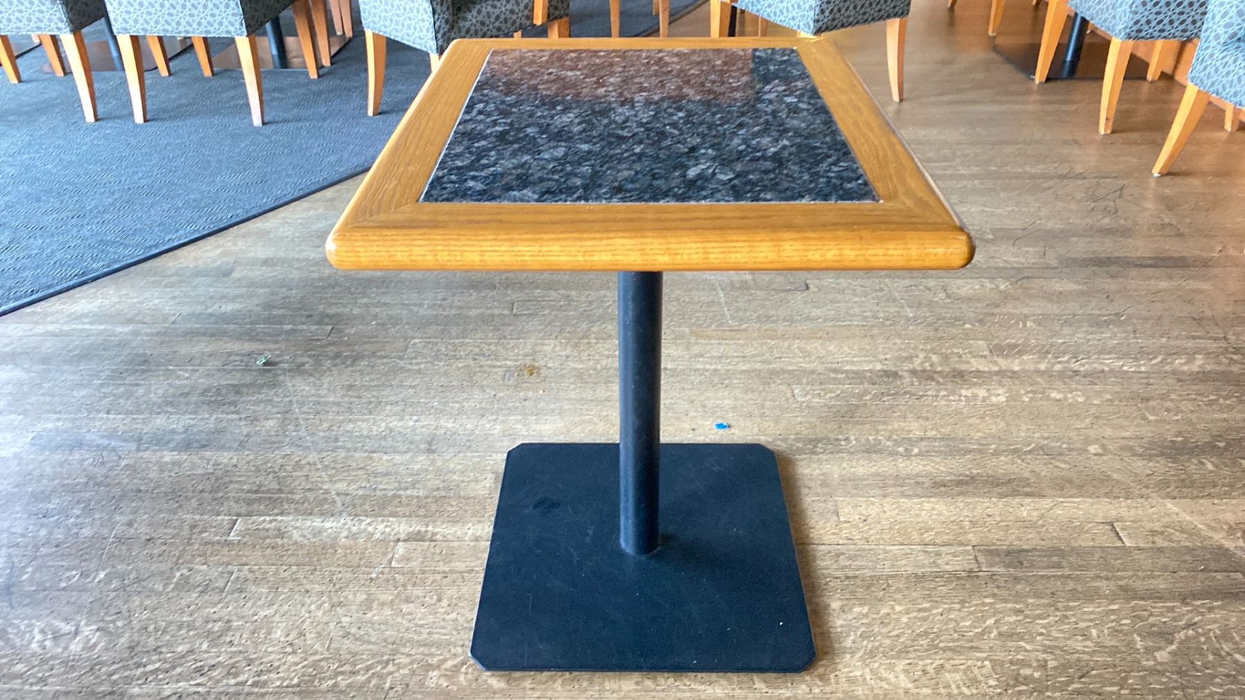 OAK AND POLISHED GRANITE TABLE TOP ON BLACK METAL PEDESTAL APPROX 29"H X 28"L X24" W