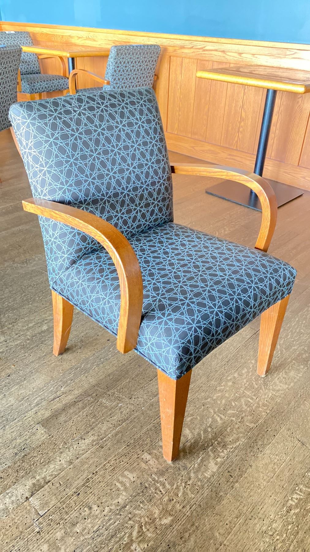OAK AND UPHOLSTERED FABRIC CUSHIONED ARM CHAIR