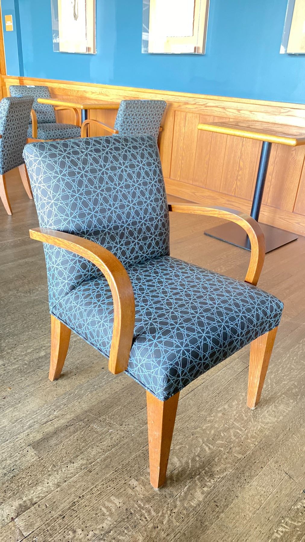 OAK AND UPHOLSTERED FABRIC CUSHIONED ARM CHAIR