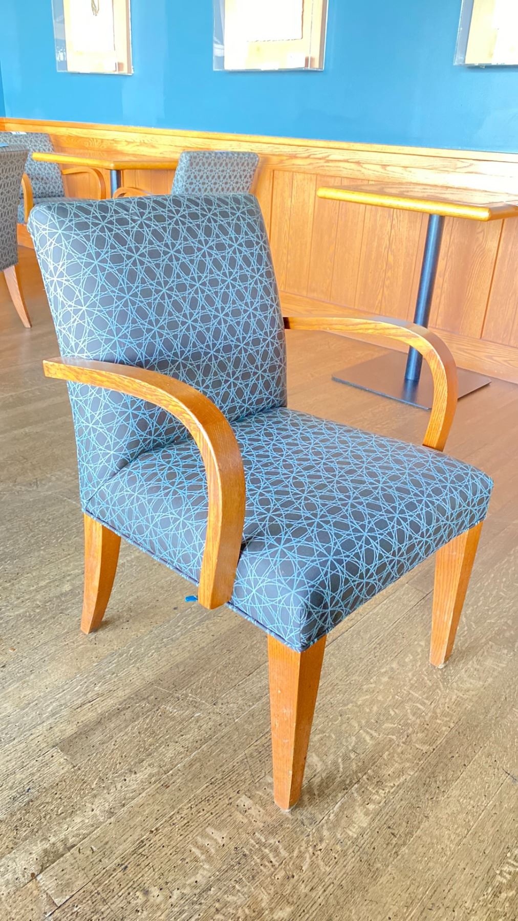 OAK AND UPHOLSTERED FABRIC CUSHIONED ARM CHAIR