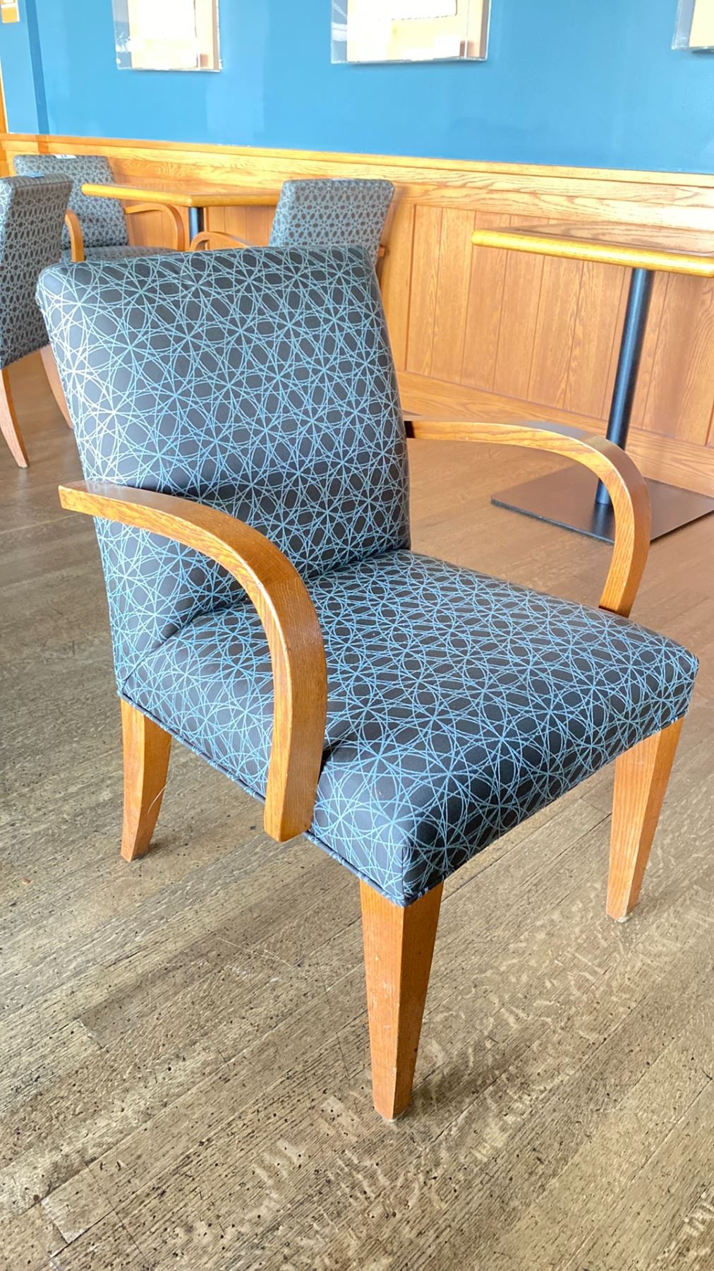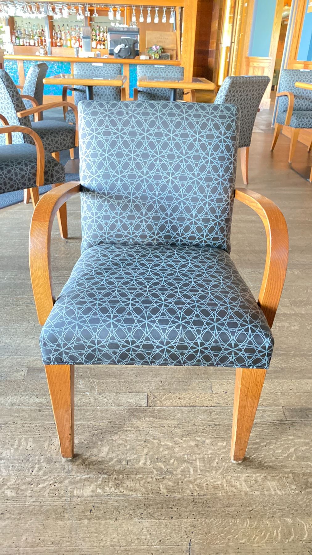 OAK AND UPHOLSTERED FABRIC CUSHIONED ARM CHAIR
