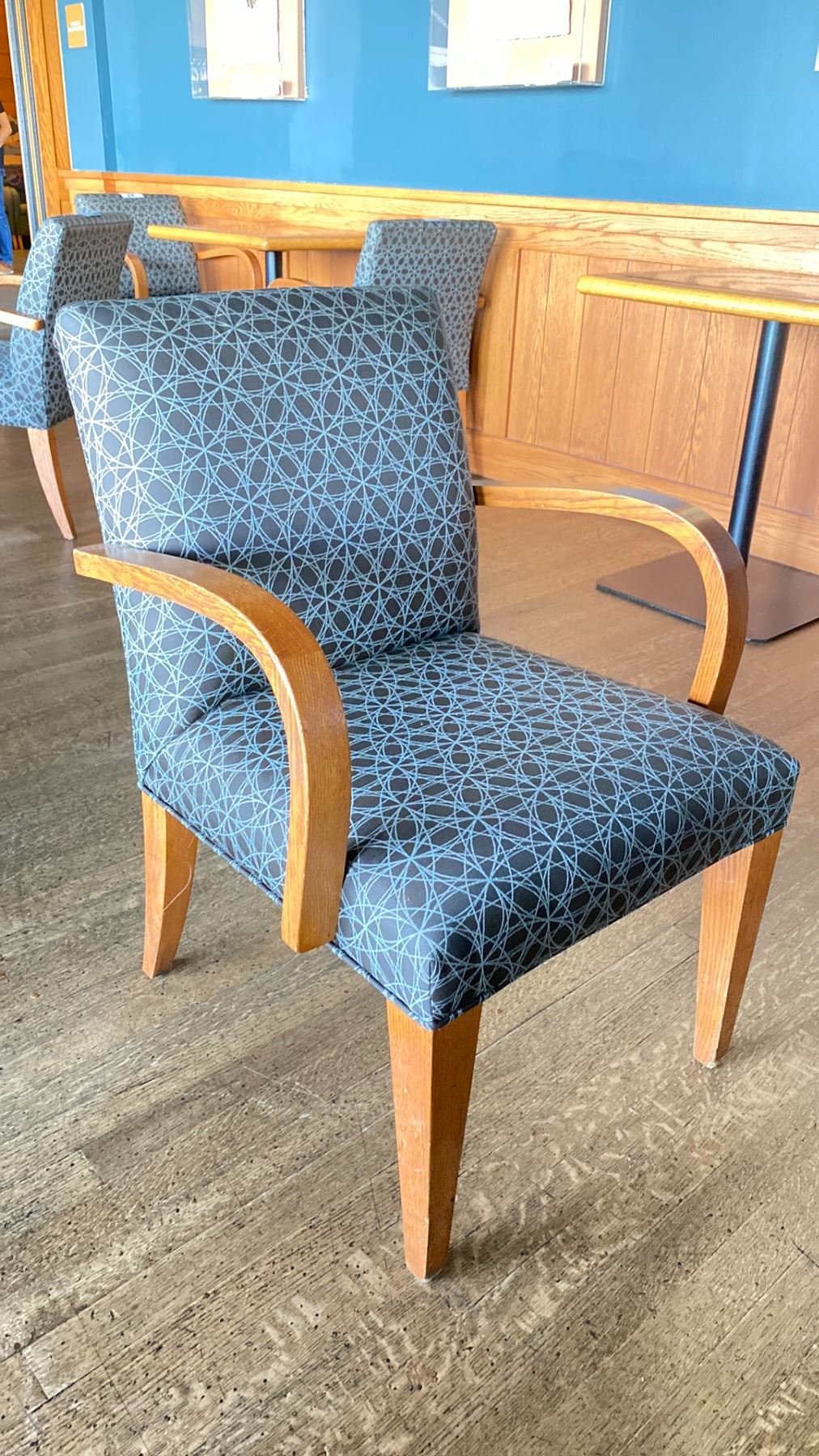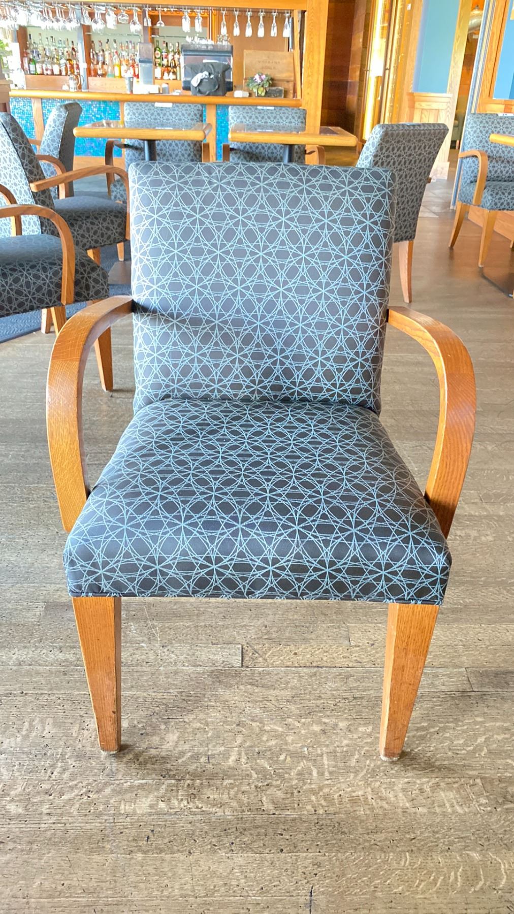 OAK AND UPHOLSTERED FABRIC CUSHIONED ARM CHAIR