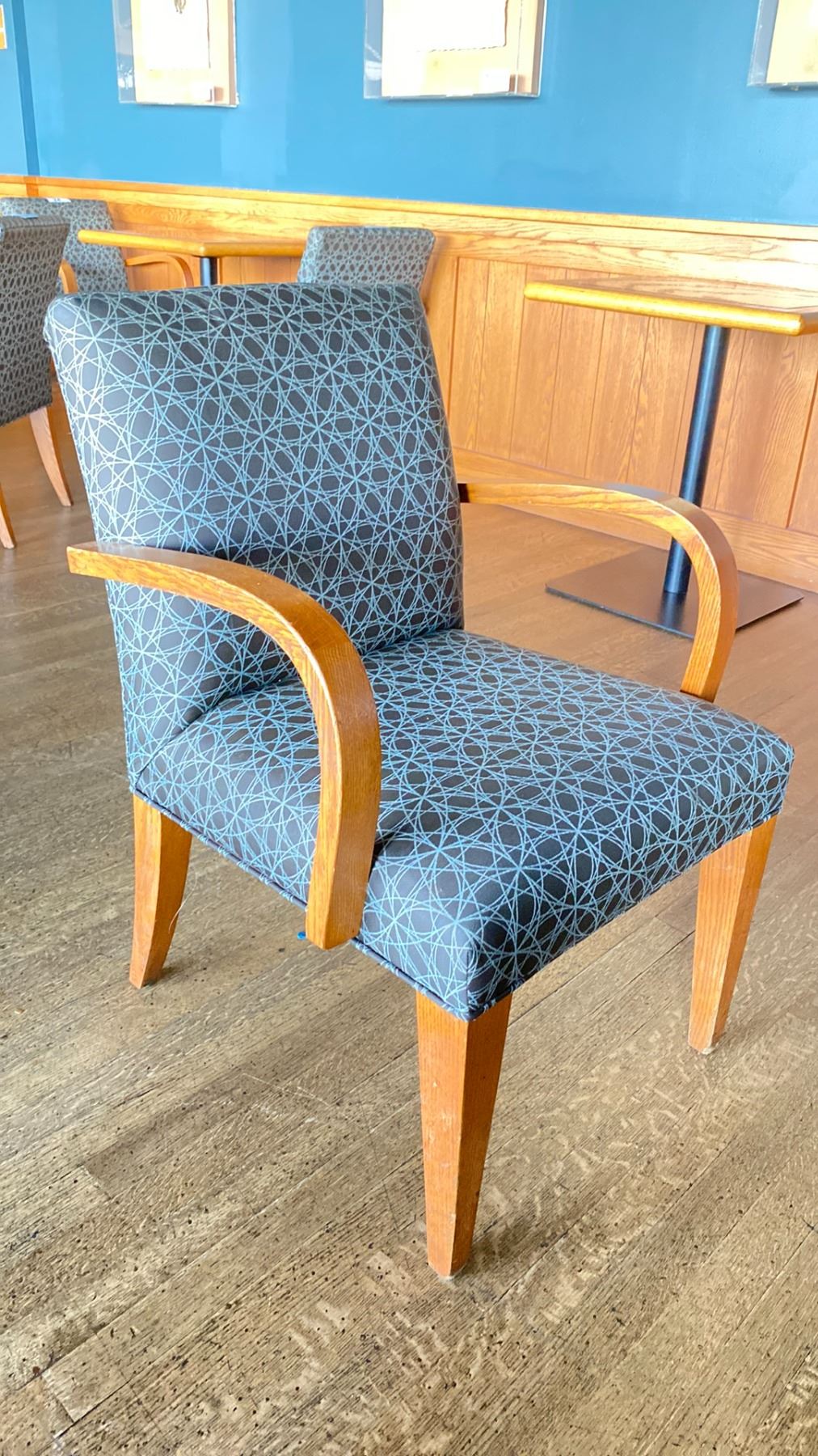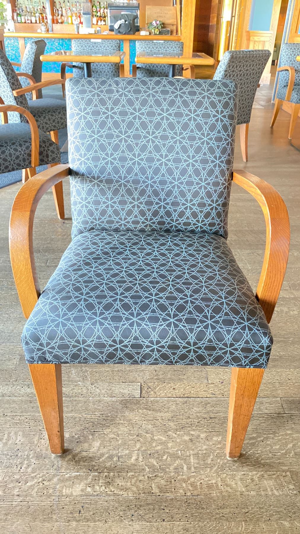 OAK AND UPHOLSTERED FABRIC CUSHIONED ARM CHAIR