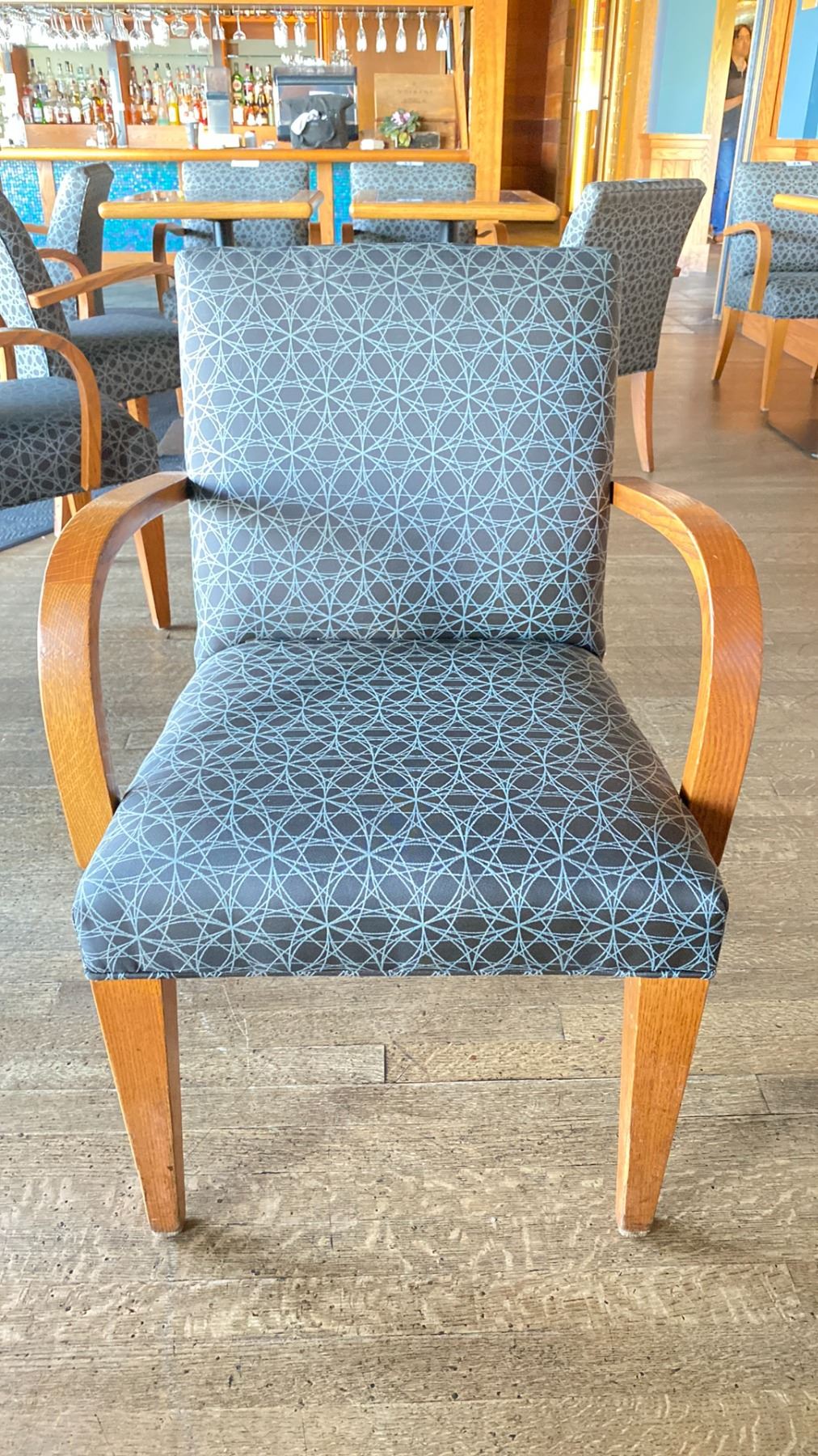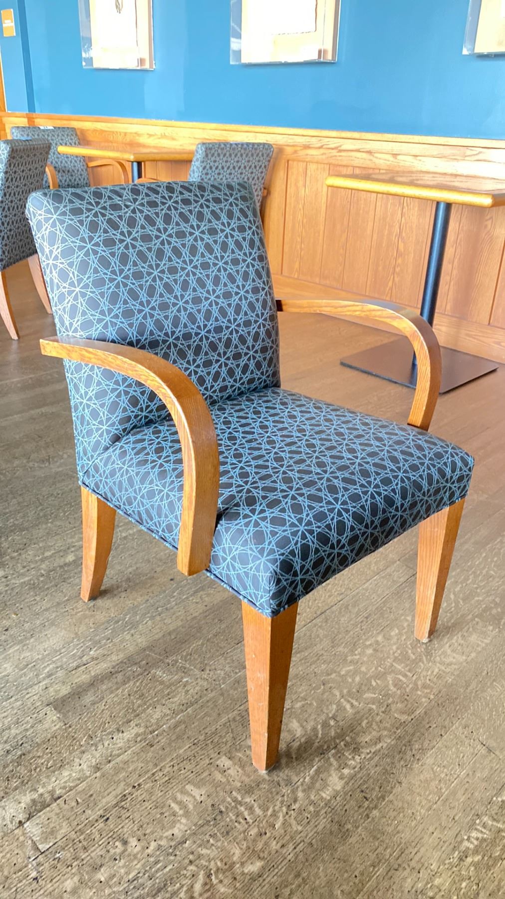 OAK AND UPHOLSTERED FABRIC CUSHIONED ARM CHAIR