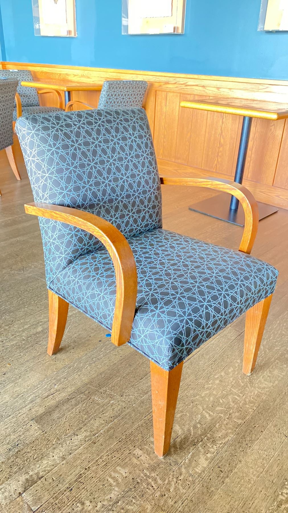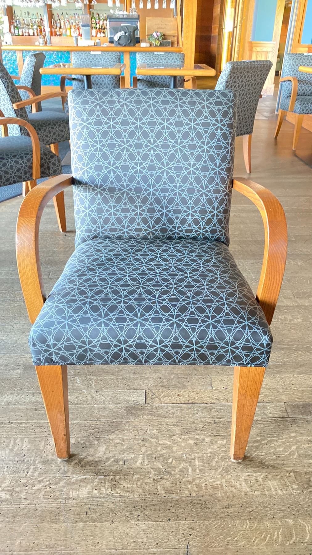 OAK AND UPHOLSTERED FABRIC CUSHIONED ARM CHAIR