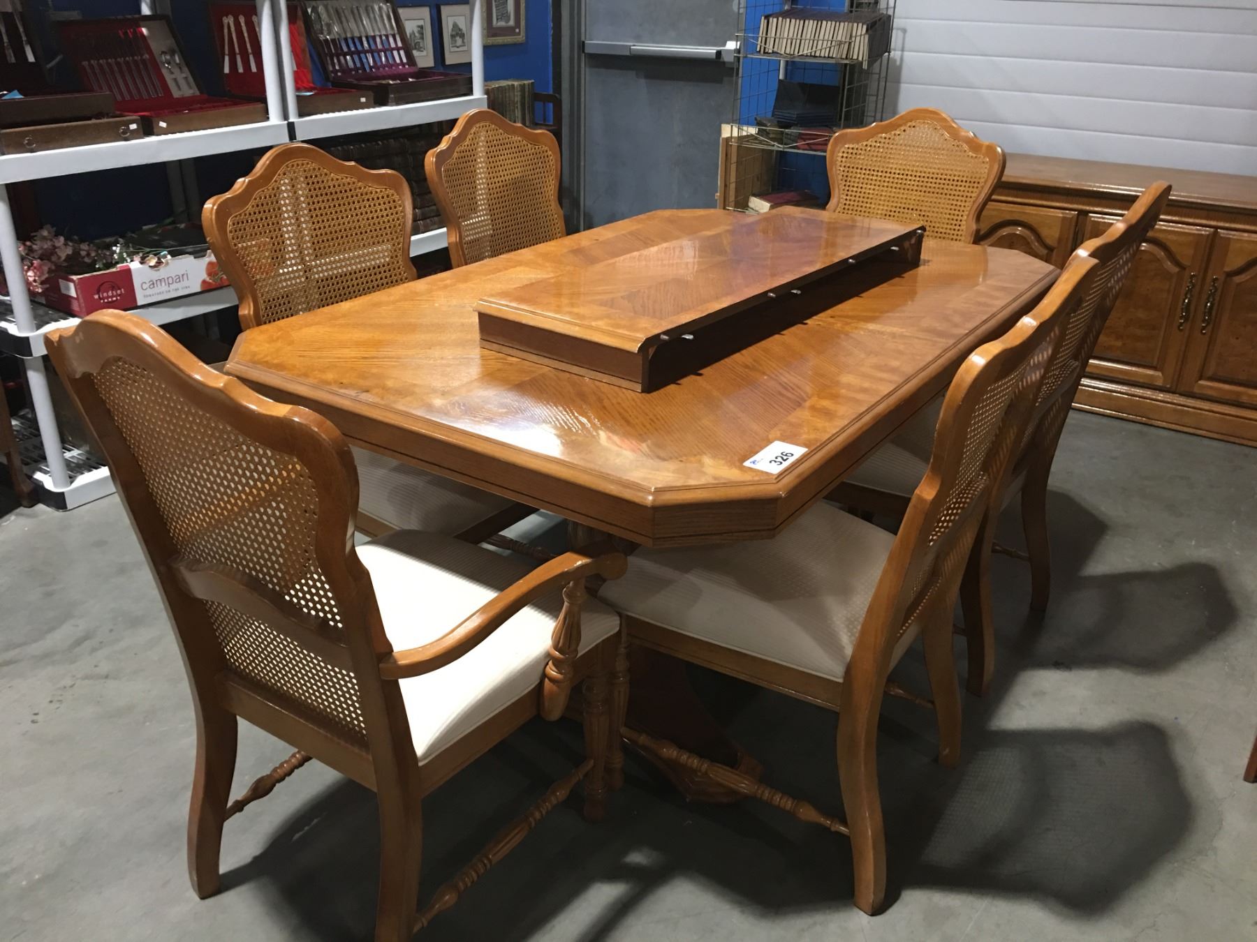 OAK DINING TABLE WITH 1 LEAF 6 CHAIRS AND MATCHING SIDEBOARD (TABLE TOP LOOSE NEEDS TO BE BOLTED DOWN)