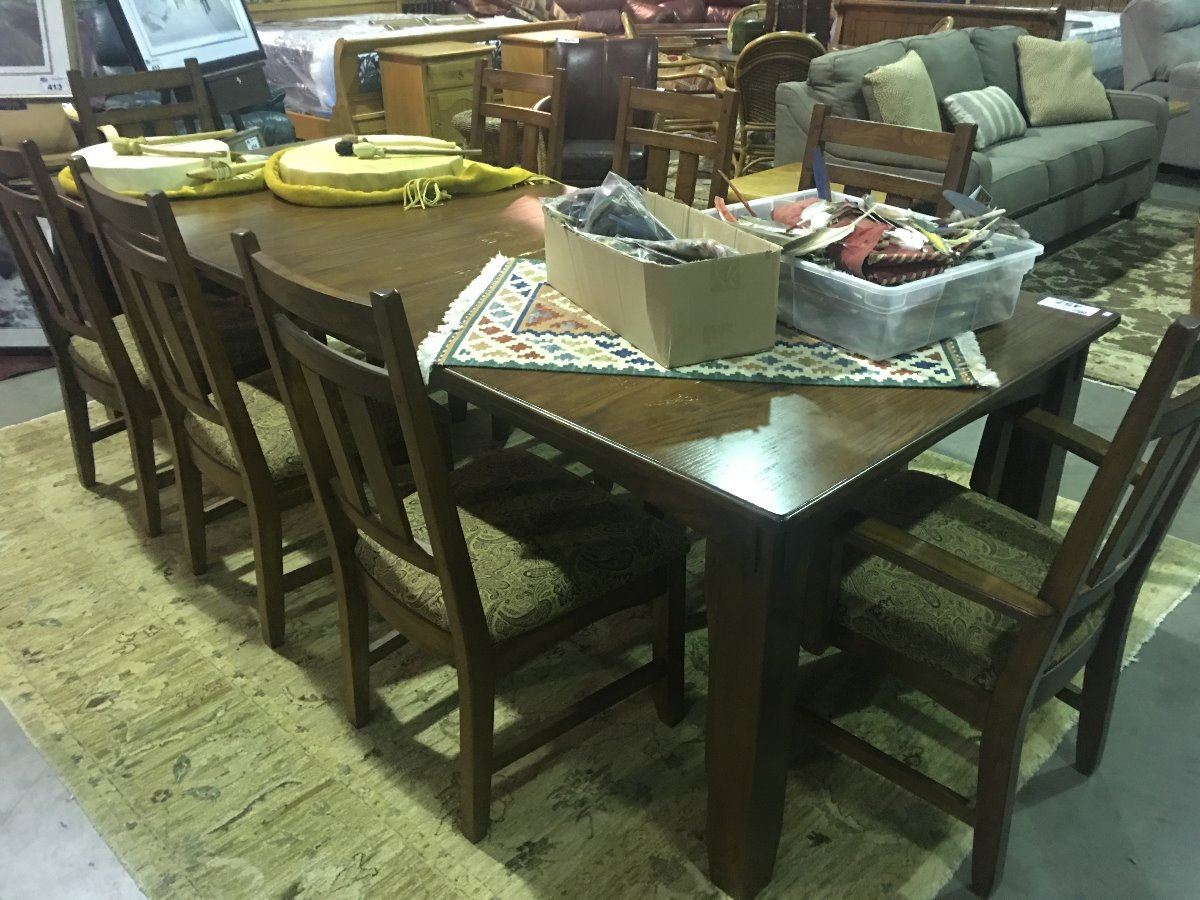 OAK DINING TABLE WITH 2 LEAFS & 8 CHAIRS, TABLE TOP SURFACE WEAR PRESENT