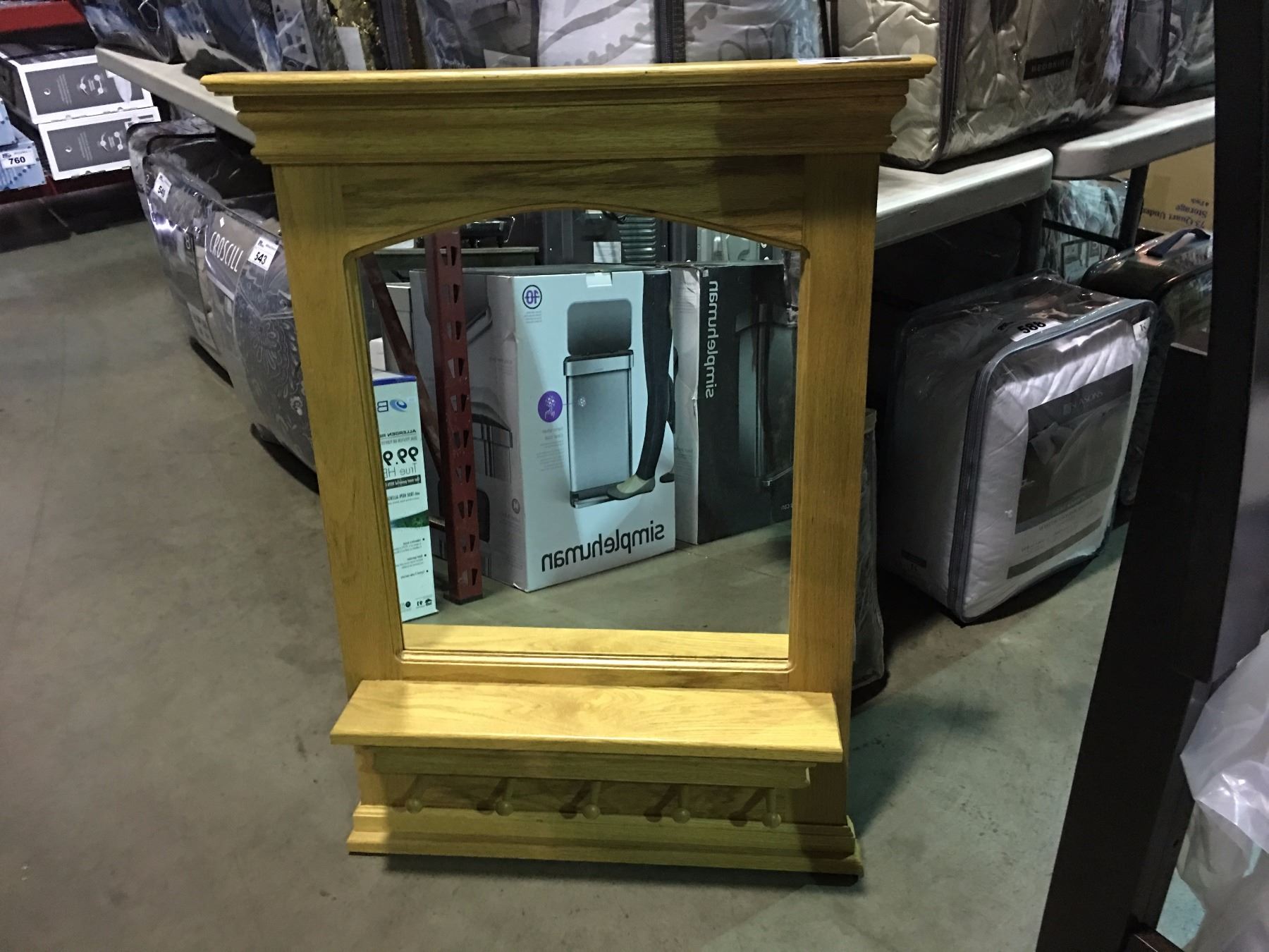 OAK FRAMED WALL MIRROR/COAT RACK WITH SHELF