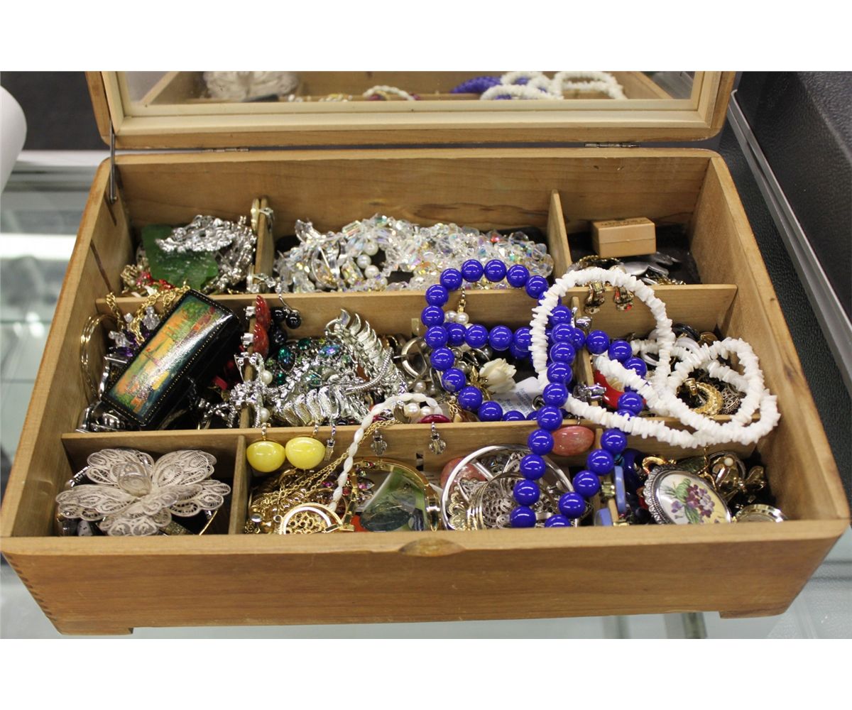OAK JEWELLRY BOX WITH COSTUME JEWELLRY
