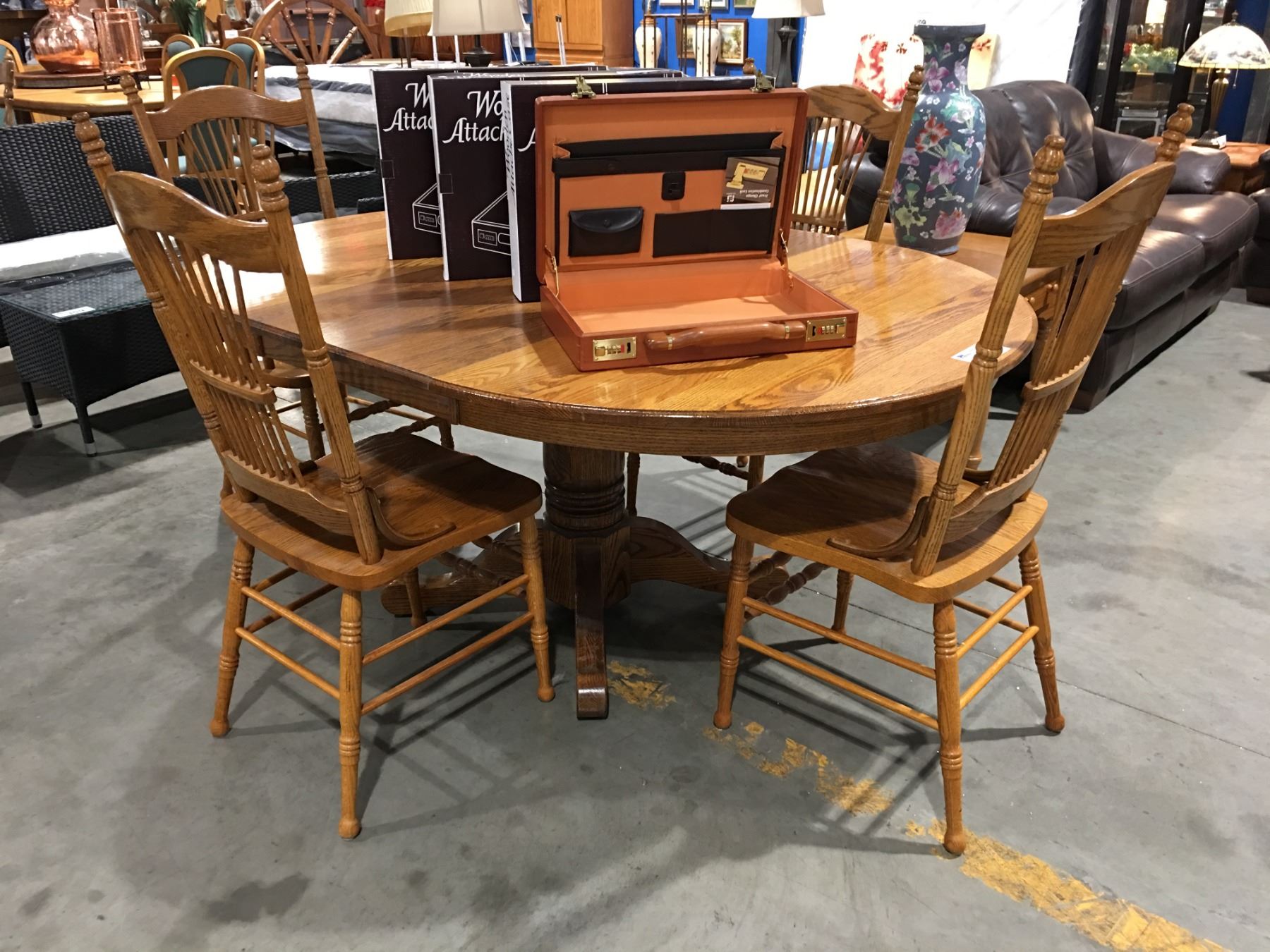 OAK SINGLE PEDESTAL DINING TABLE WITH 1 LEAF & 4 CHAIRS
