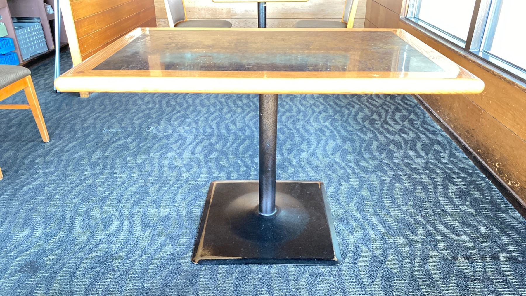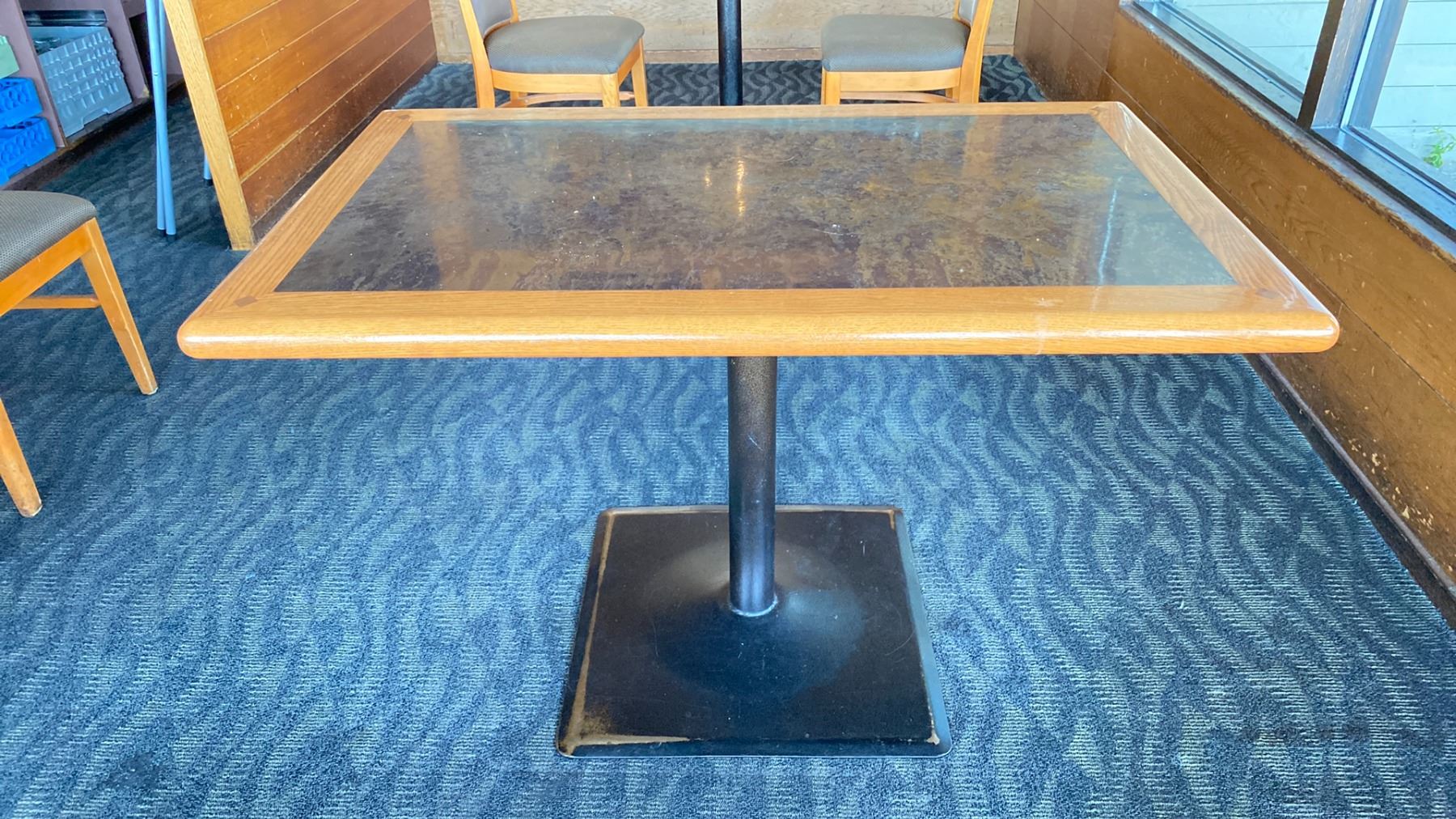 OAK TABLE WITH TWO TONE TOP BLACK METAL PEDESTAL APPROX 45" L X 28" W X 29"H