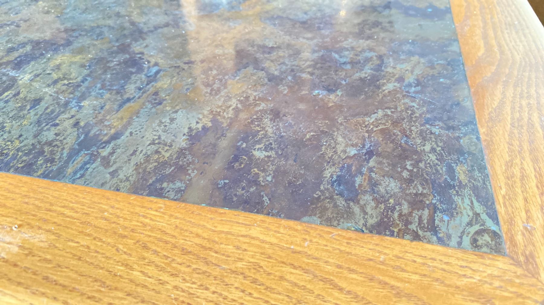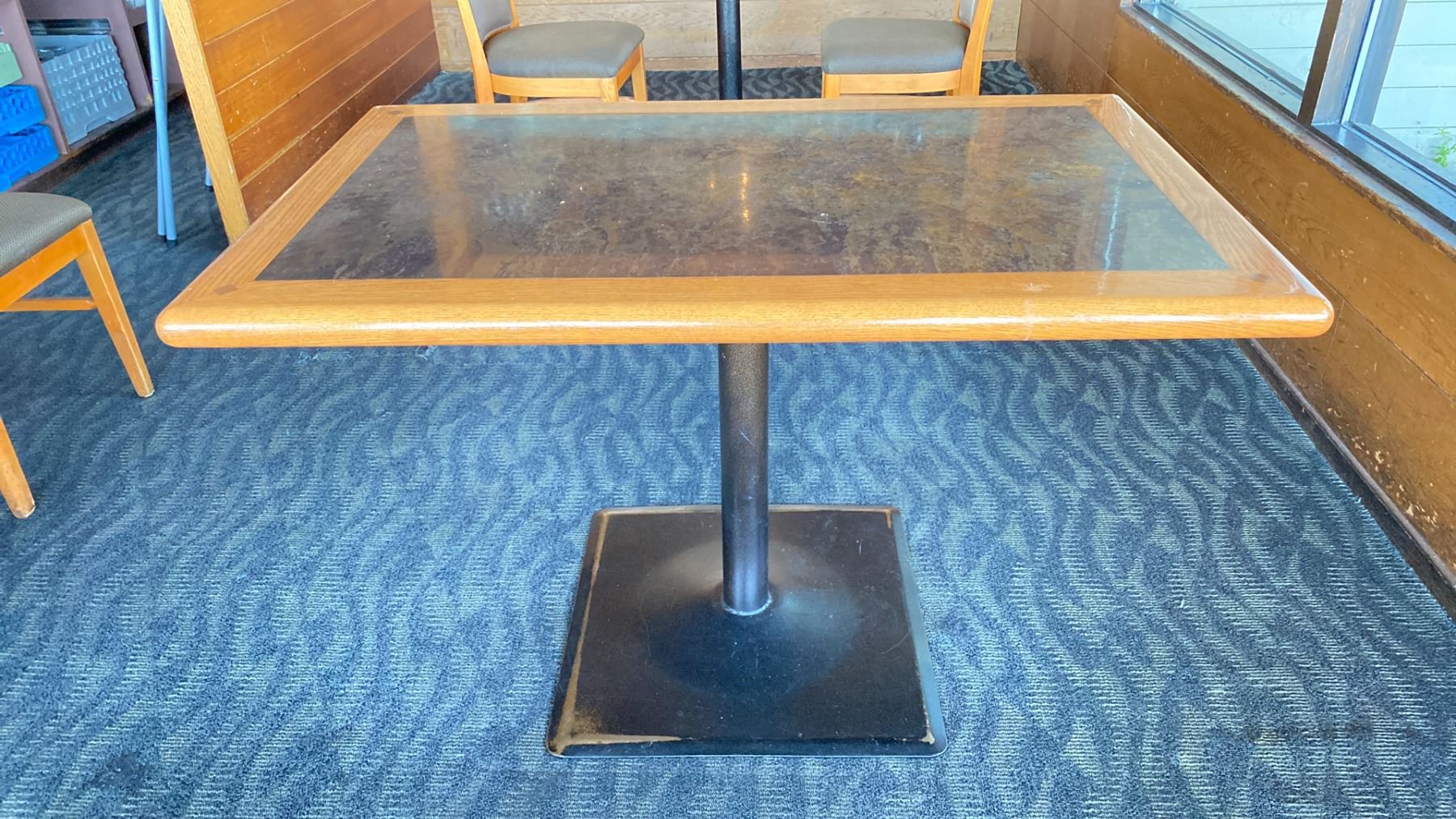 OAK TABLE WITH TWO TONE TOP BLACK METAL PEDESTAL APPROX 45" L X 28" W X 29"H
