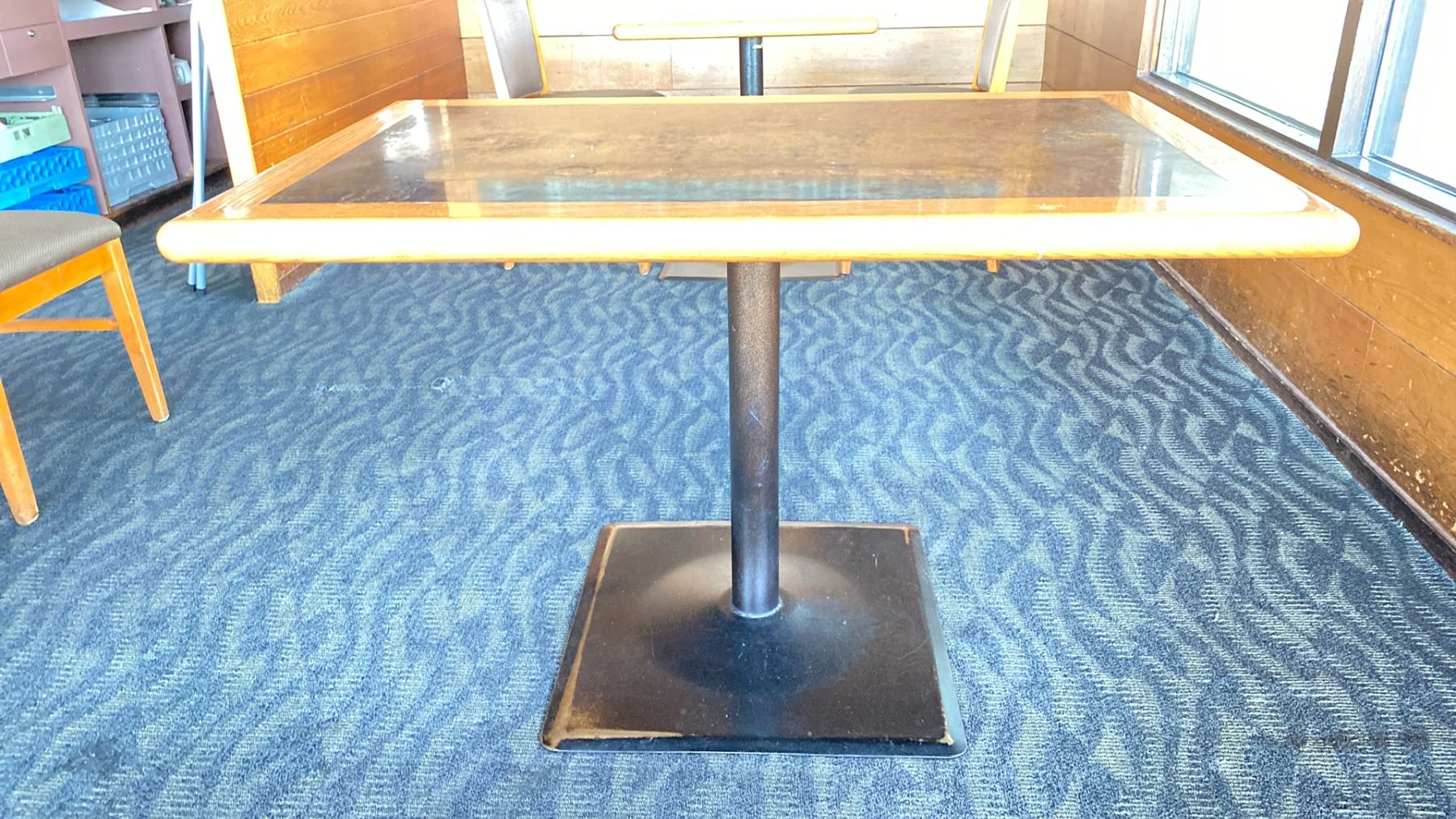 OAK TABLE WITH TWO TONE TOP BLACK  METAL PEDESTAL APPROX 45  L X 28  W X 29 H