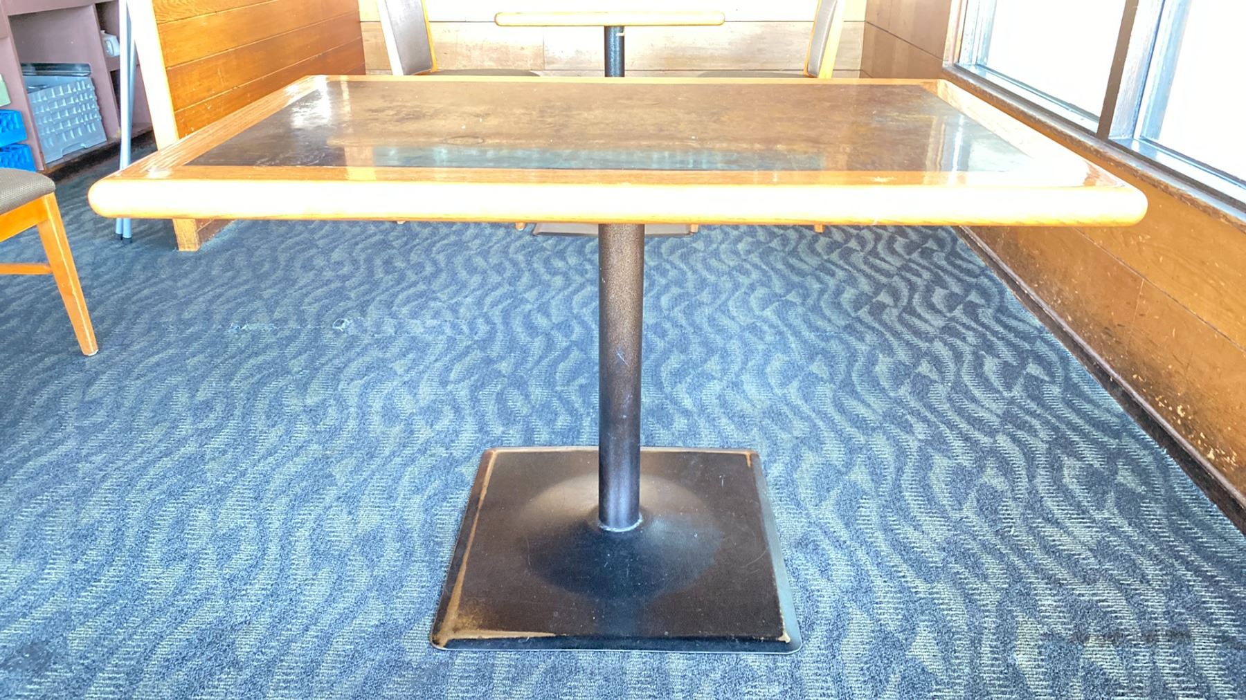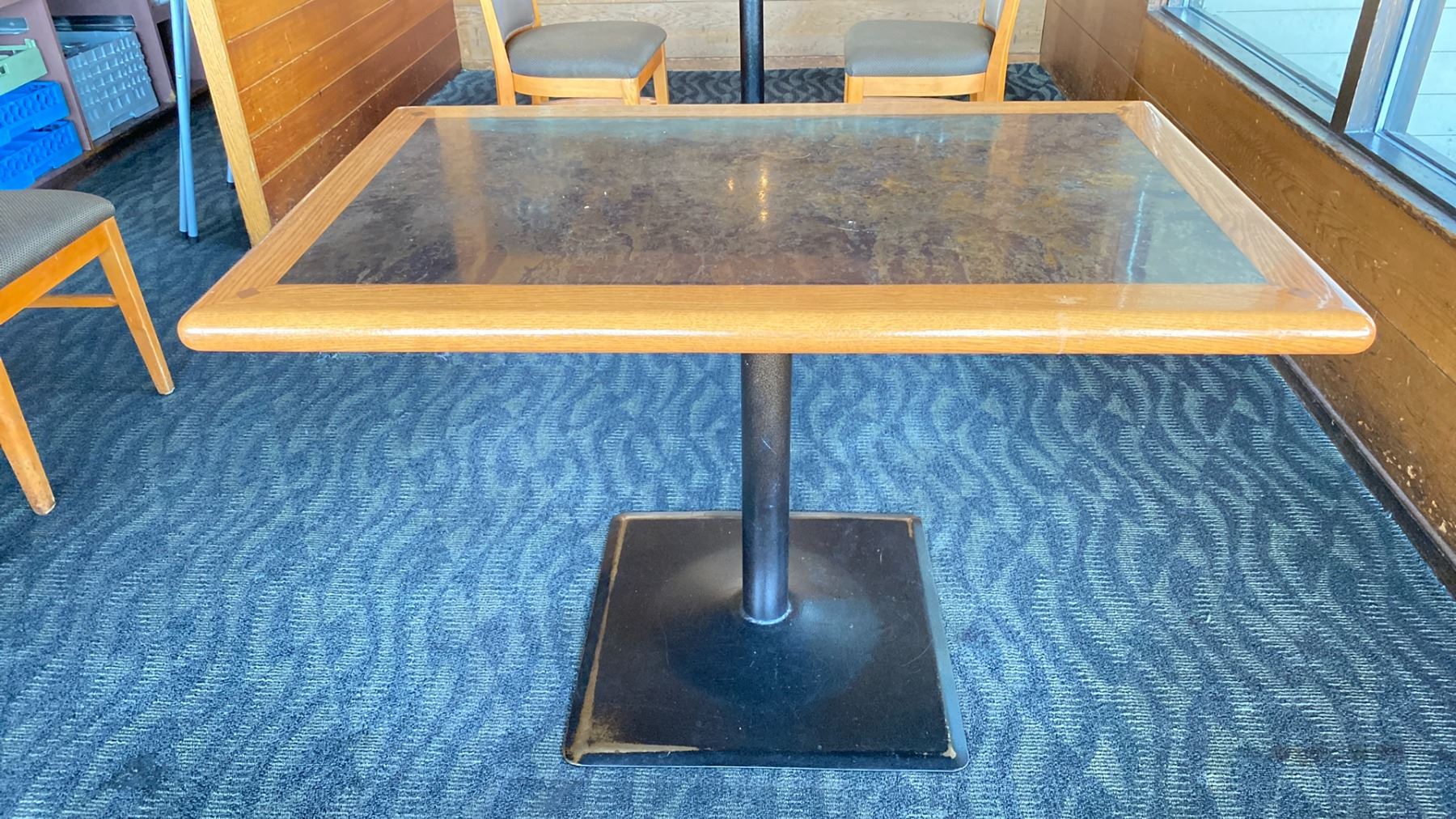 OAK TABLE WITH TWO TONE TOP BLACK METAL PEDESTAL APPROX 45" L X 28" W X 29"H