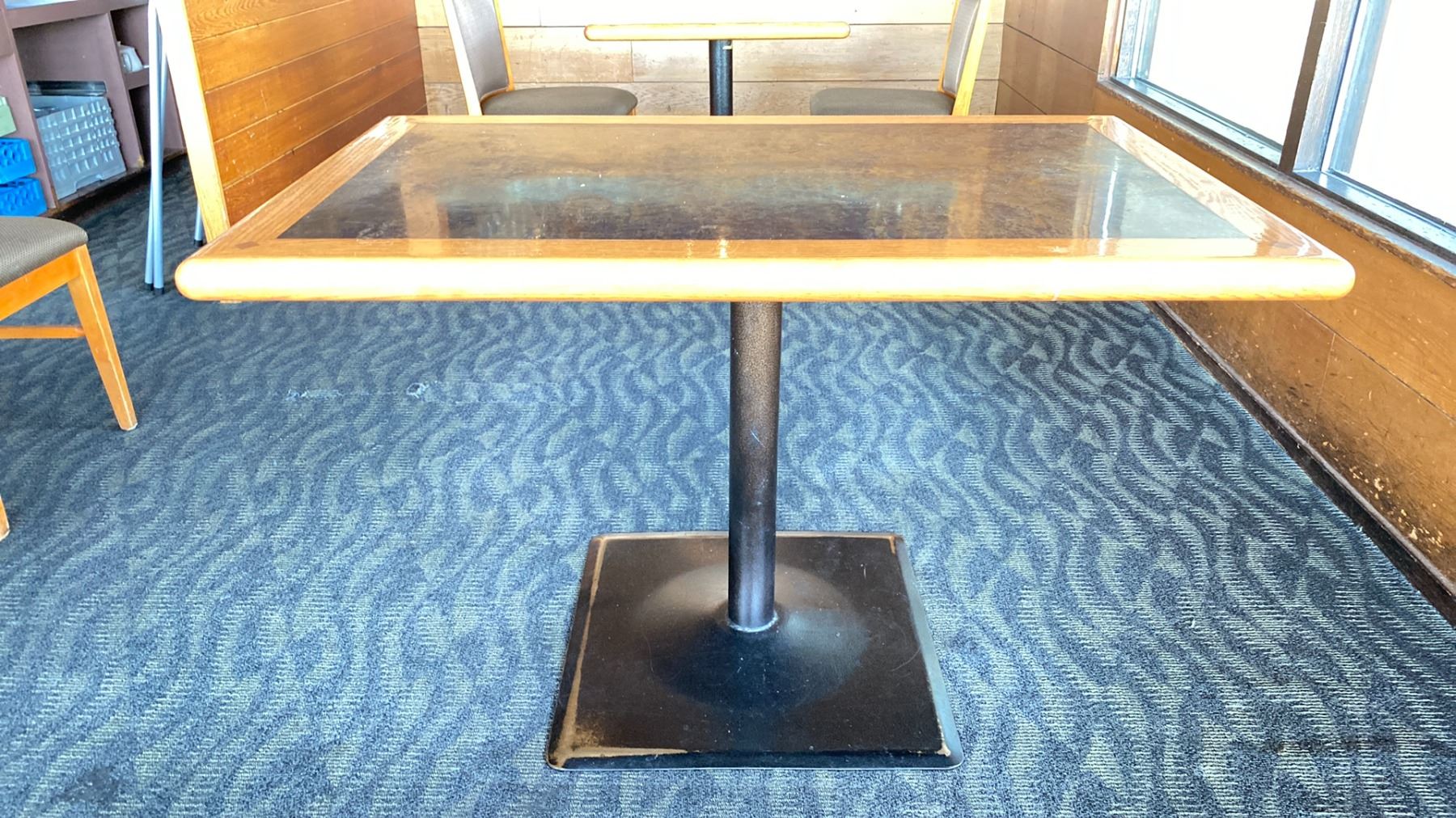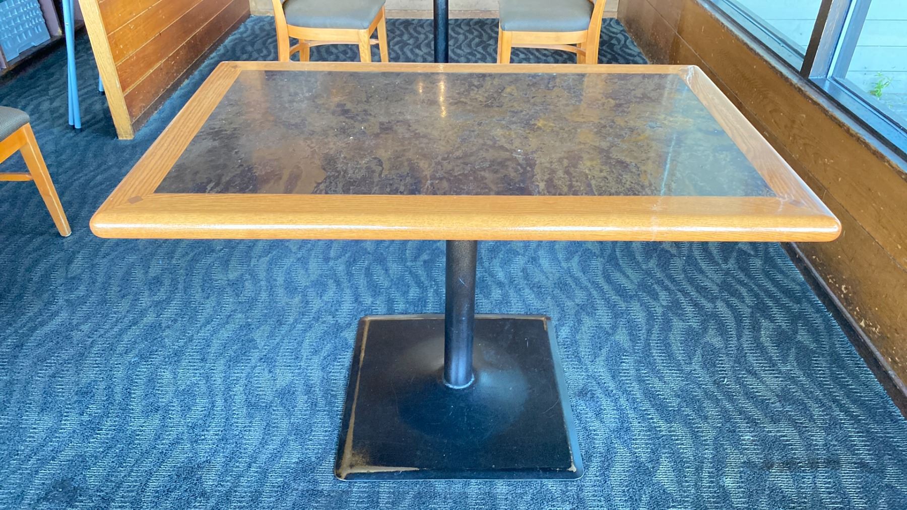 OAK TABLE WITH TWO TONE TOP BLACK METAL PEDESTAL APPROX 45" L X 28" W X 29"H